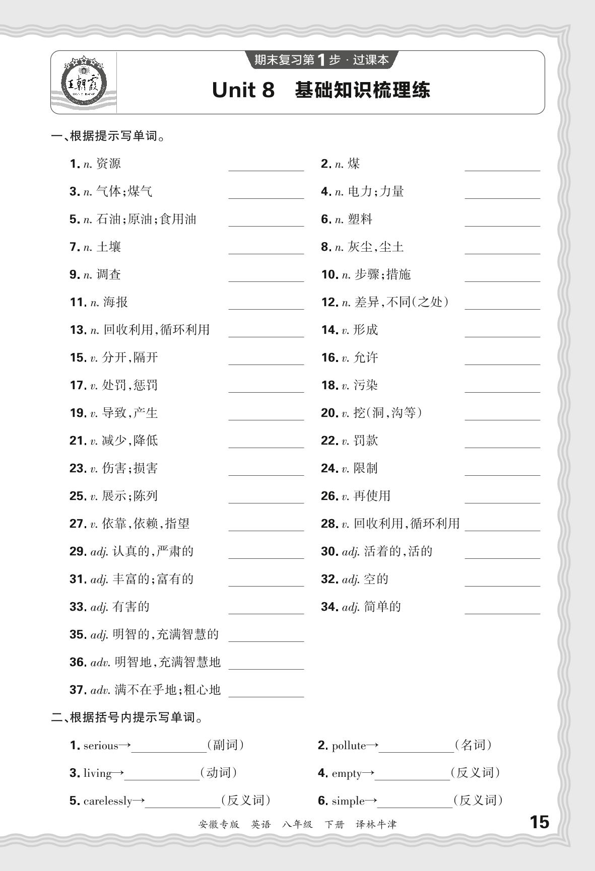 2024春下册八年级英语译林牛津版 期末过课本安徽版·Unit 8 基础知识梳理练