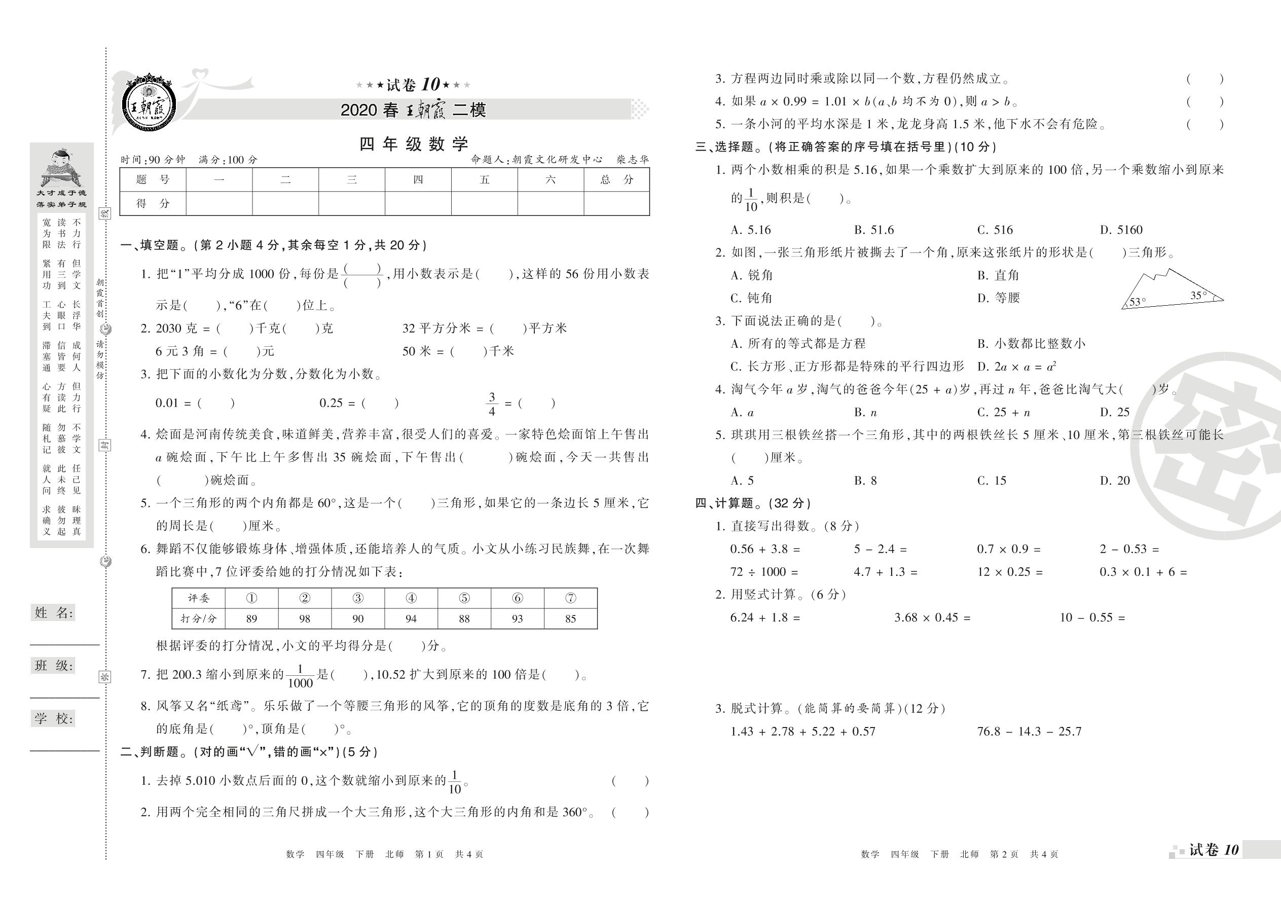 王朝霞期末模拟卷四年级下册数学(北师版)_R210804143900【10】