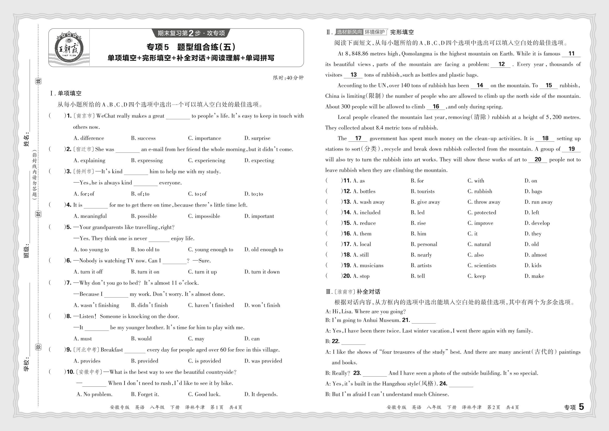 2024春下册八年级英语译林牛津版 期末专项卷安徽版·题型组合练(五)