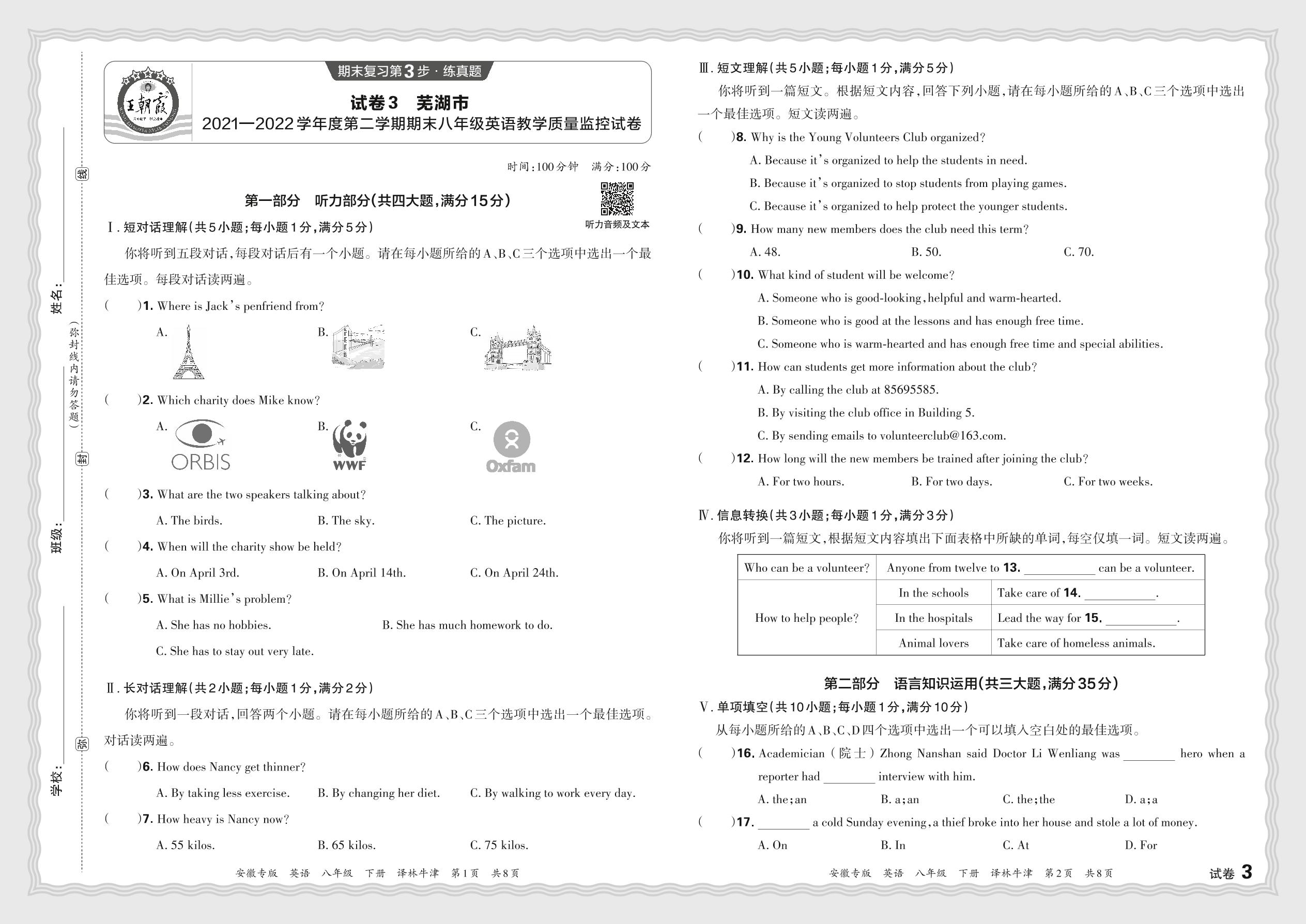 安徽省芜湖市2022-2023学年度第二学期期末八年级英语教学质量监控试卷(译林牛津版)【3】