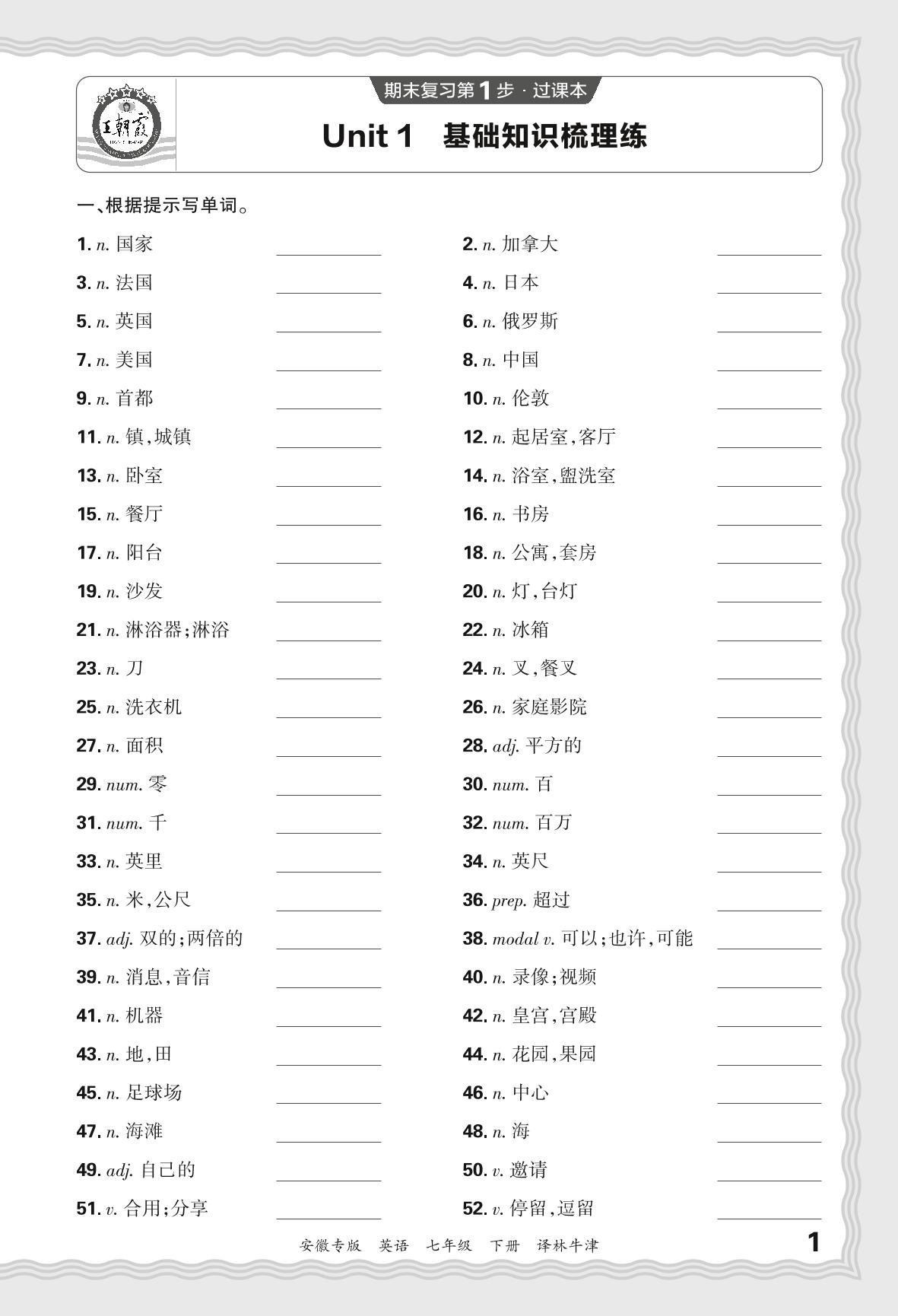 2024春下册七年级英语译林牛津版 期末过课本安徽版·Unit 1 基础知识梳理练