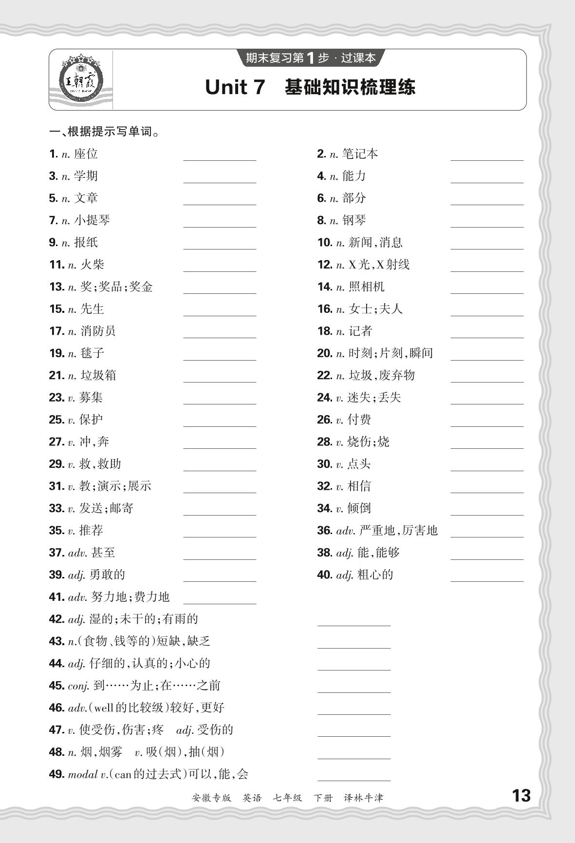 2024春下册七年级英语译林牛津版 期末过课本安徽版·Unit 7 基础知识梳理练