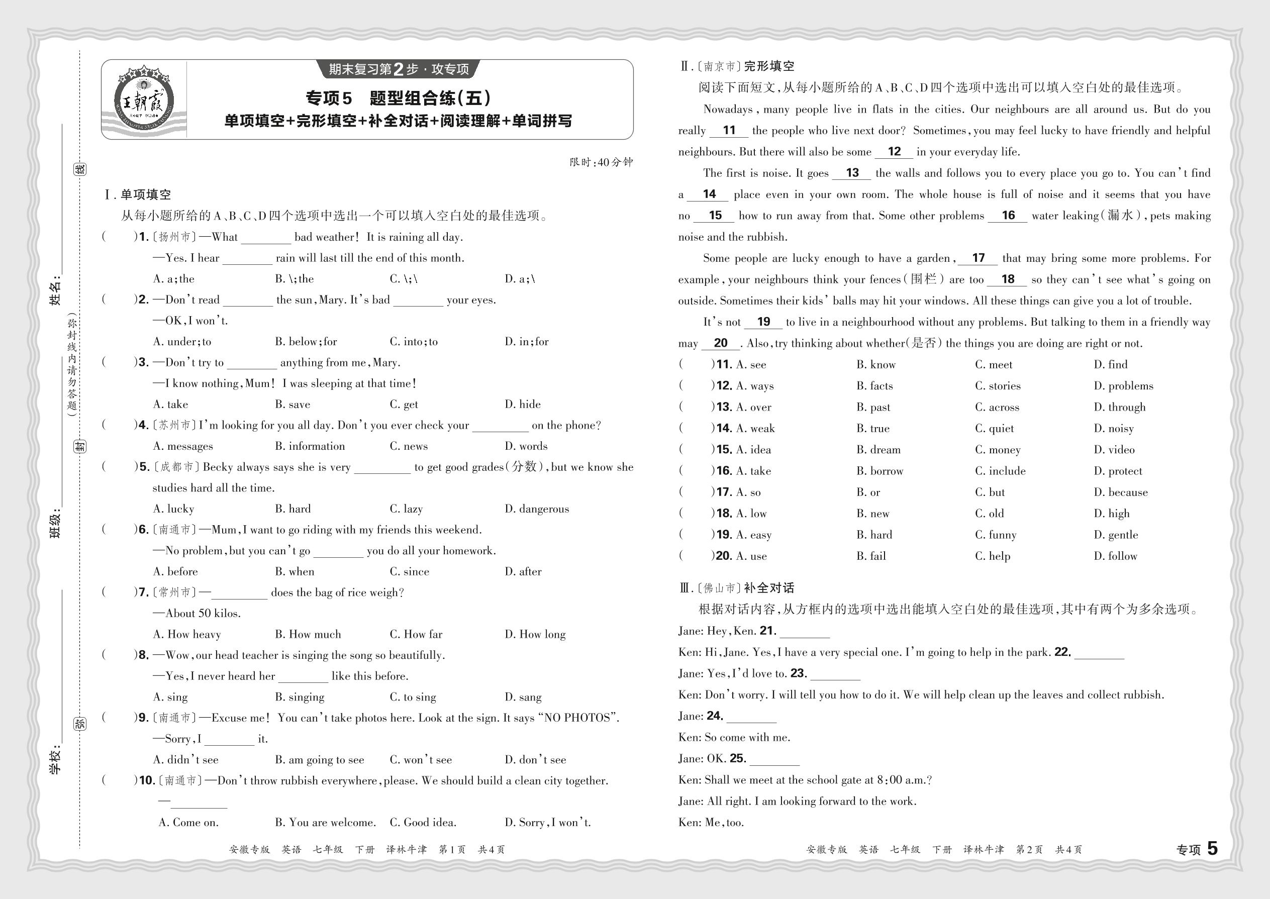 2024春下册七年级英语译林牛津版 期末专项卷安徽版·题型组合练(五)