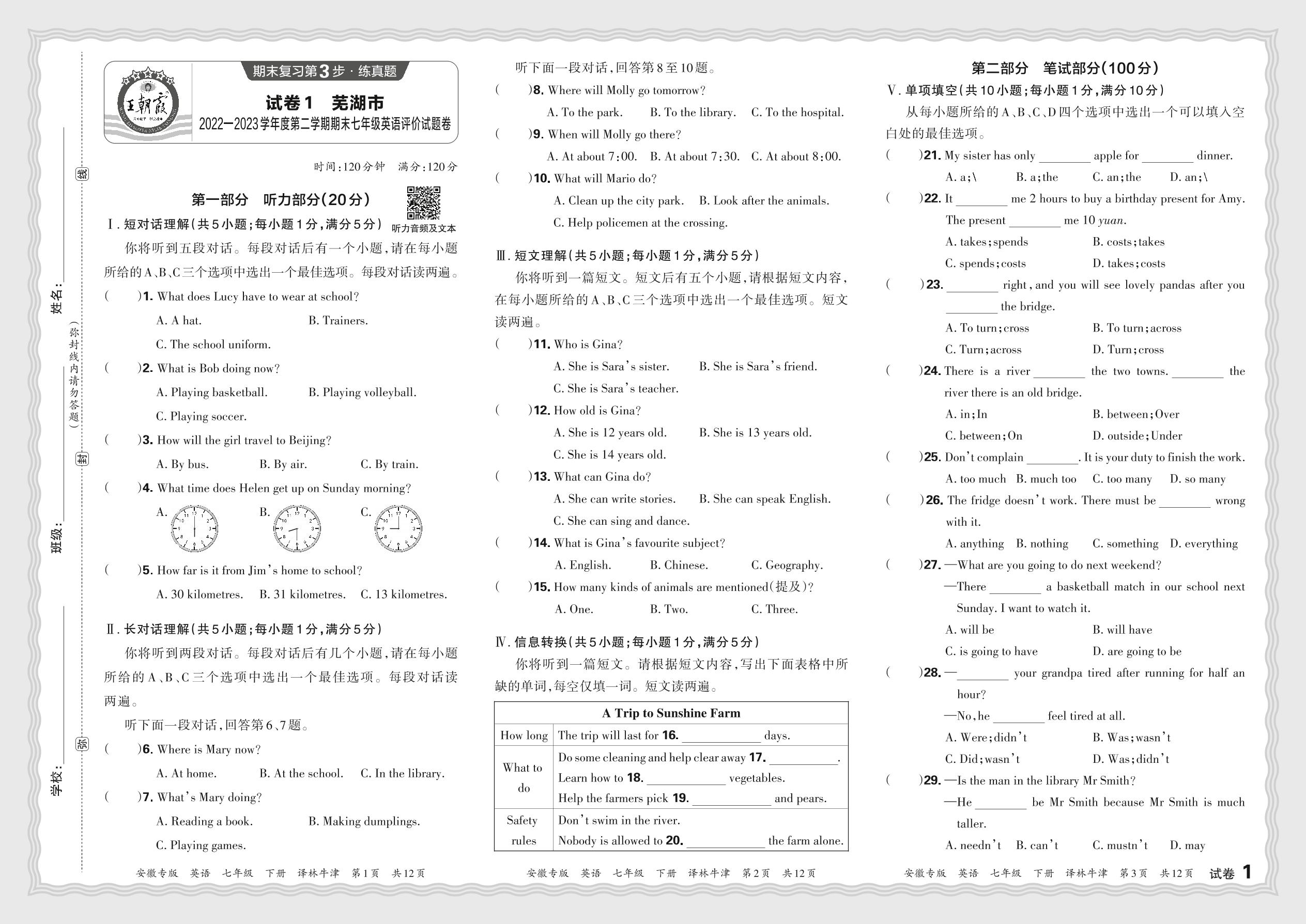 安徽省芜湖市2022-2023学年度第二学期期末七年级英语评价试题卷(译林牛津版)【1】