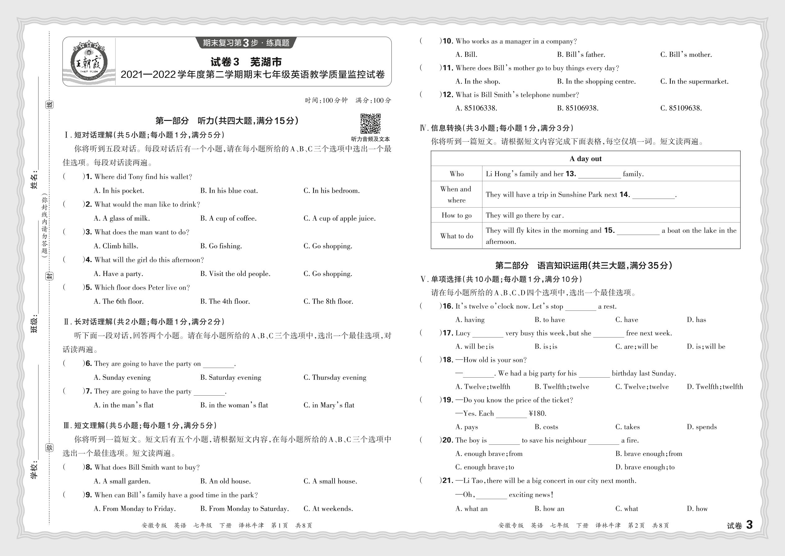 安徽省芜湖市2021-2022学年度第二学期期末七年级英语教学质量监控试卷(译林牛津版)【3】