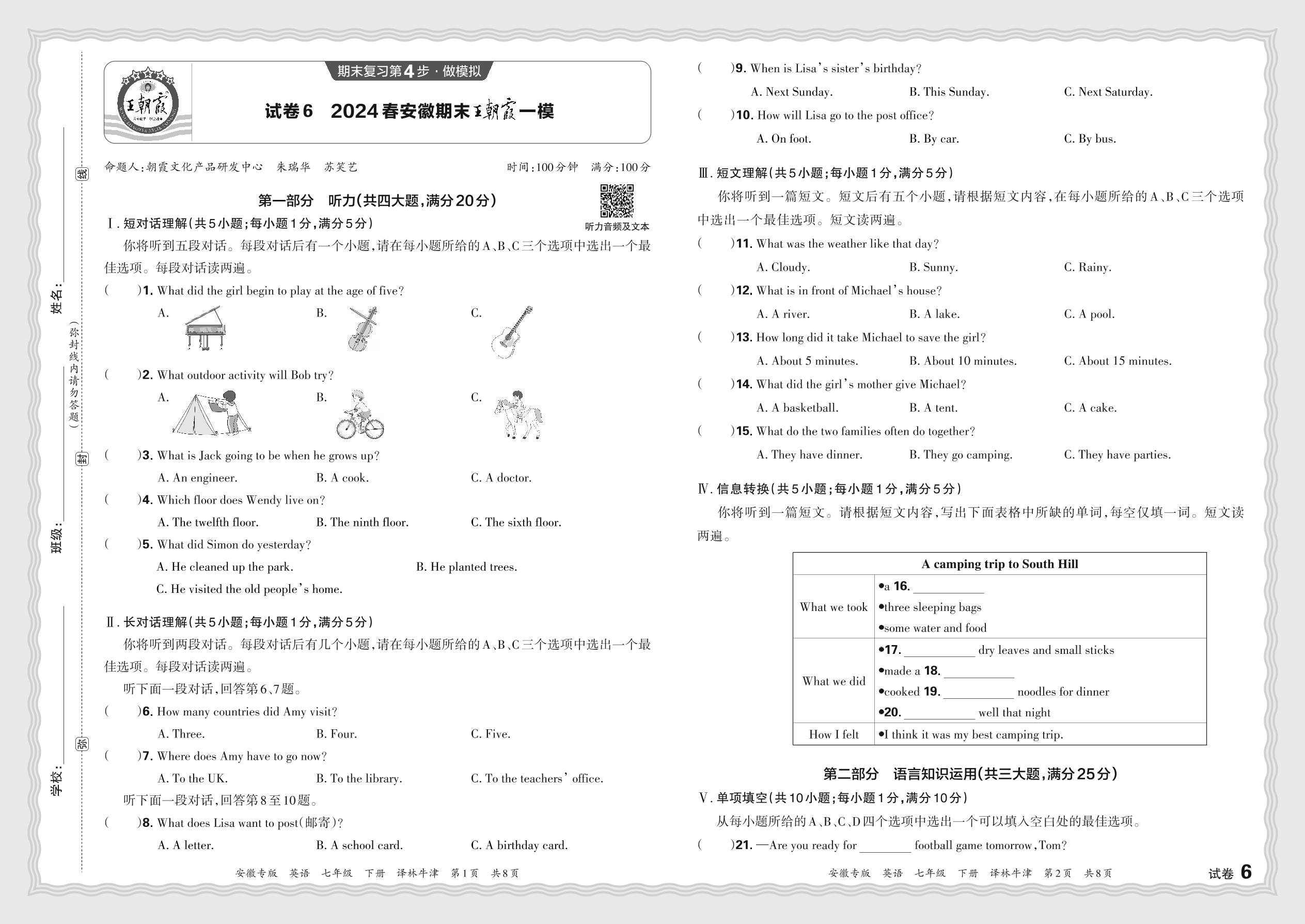 2024春下册七年级英语译林牛津版 安徽期末王朝霞一模