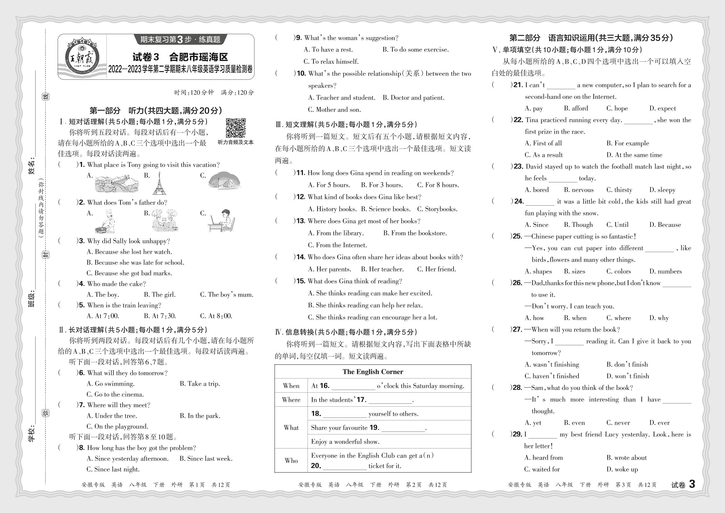 安徽省合肥市瑶海区2022-2023学年第二学期期末八年级英语学习质量检测卷(外研版)【3】