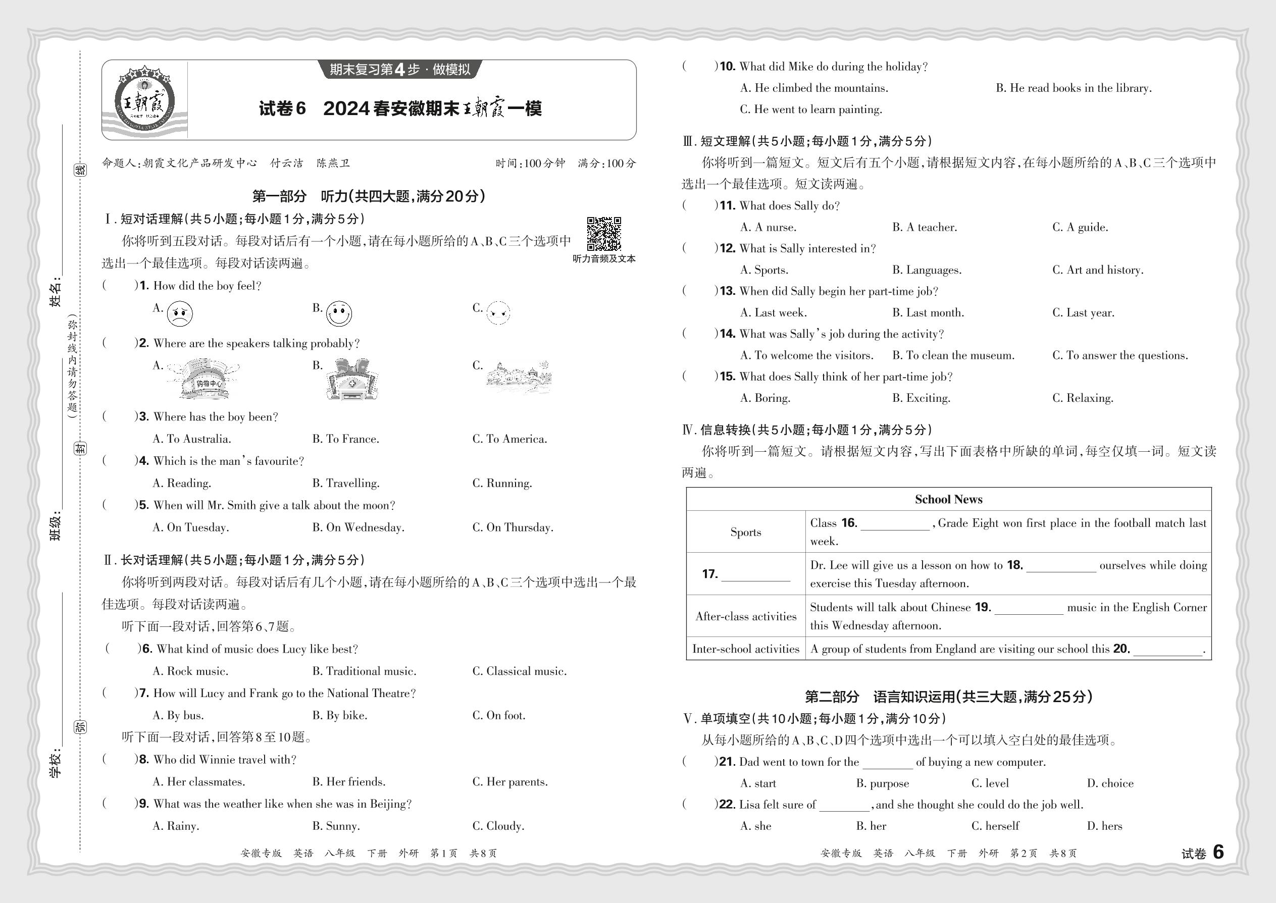 2024春下册八年级英语外研版 安徽期末王朝霞一模