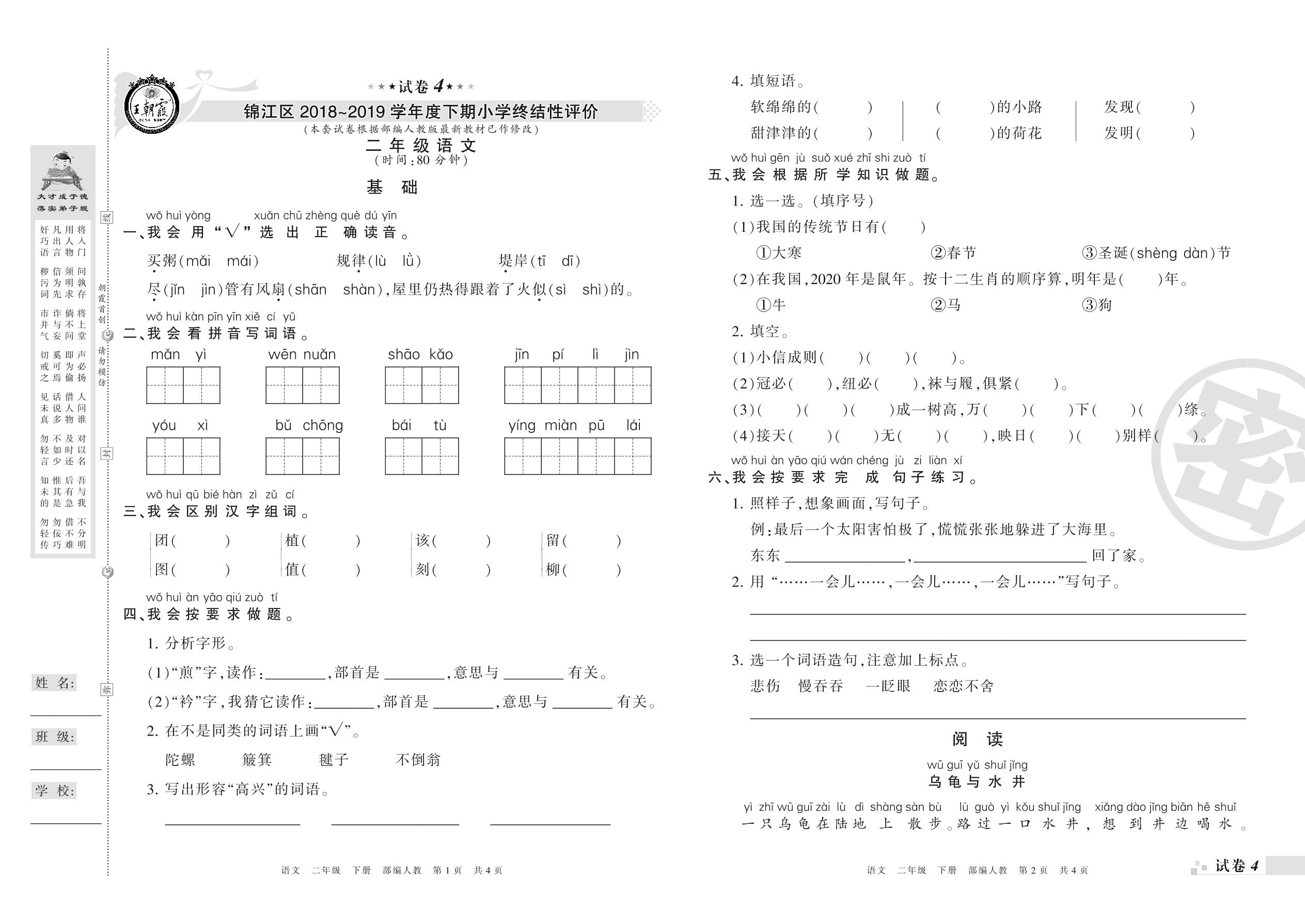 2018-2019学年第二学期成都市锦江区二年级语文试卷(人教版)【4】