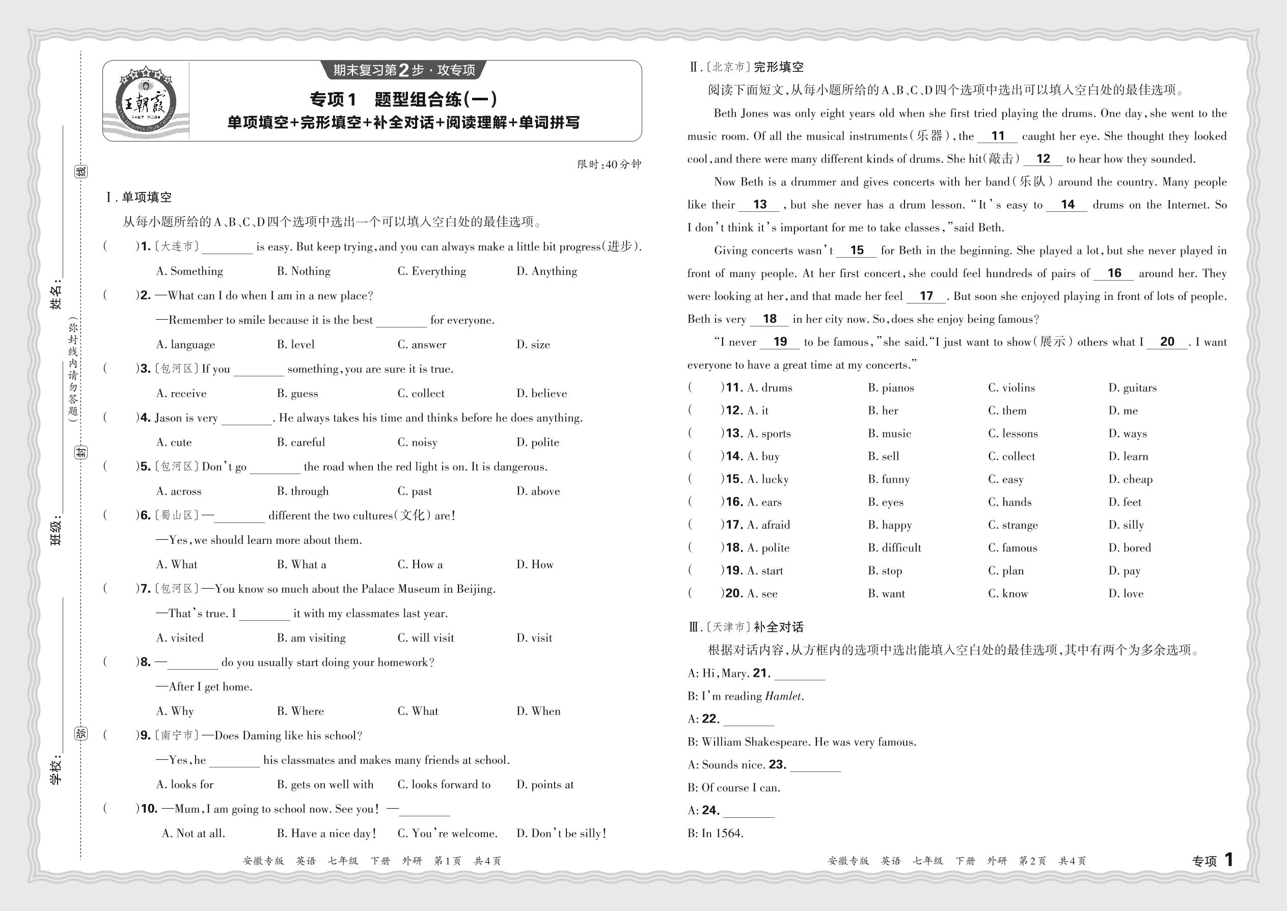 2024春下册七年级英语外研版 期末专项卷安徽版·题型组合练(一)
