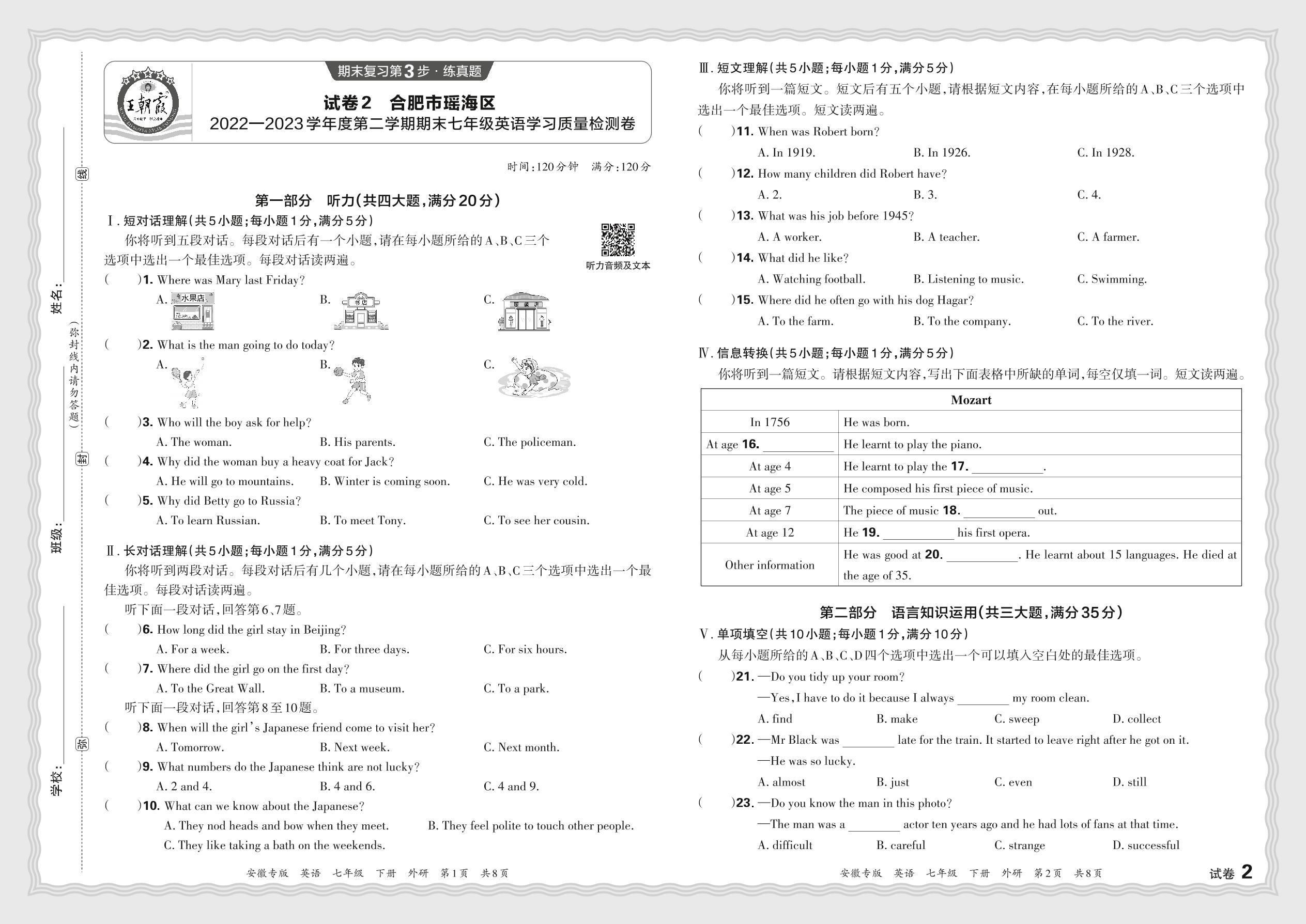 安徽省合肥市瑶海区2022-2023学年度第二学期期末七年级英语学习质量检测卷(外研版)【2】
