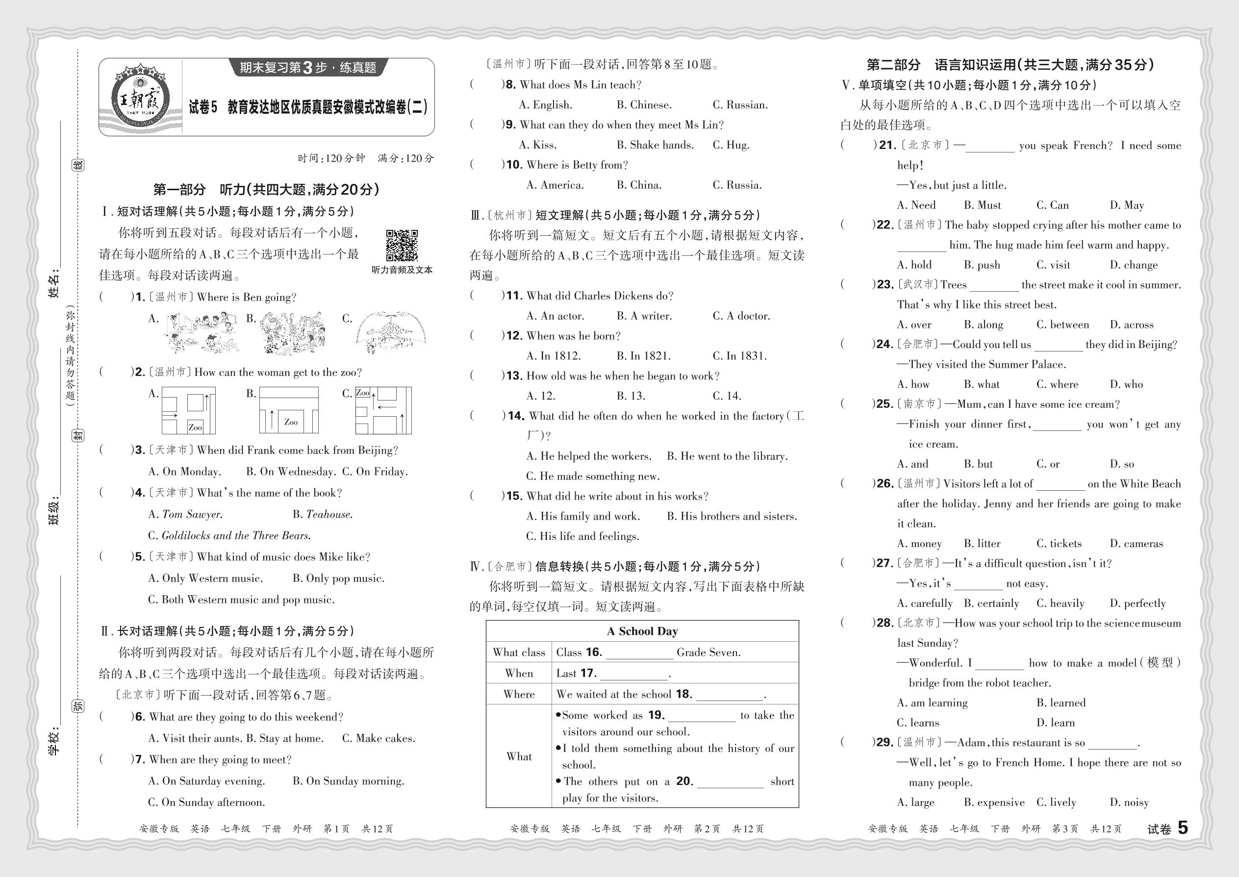 2024年春教育发达地区优质真题安徽模式改编卷(二)七年级下册期末英语(外研版)【5】