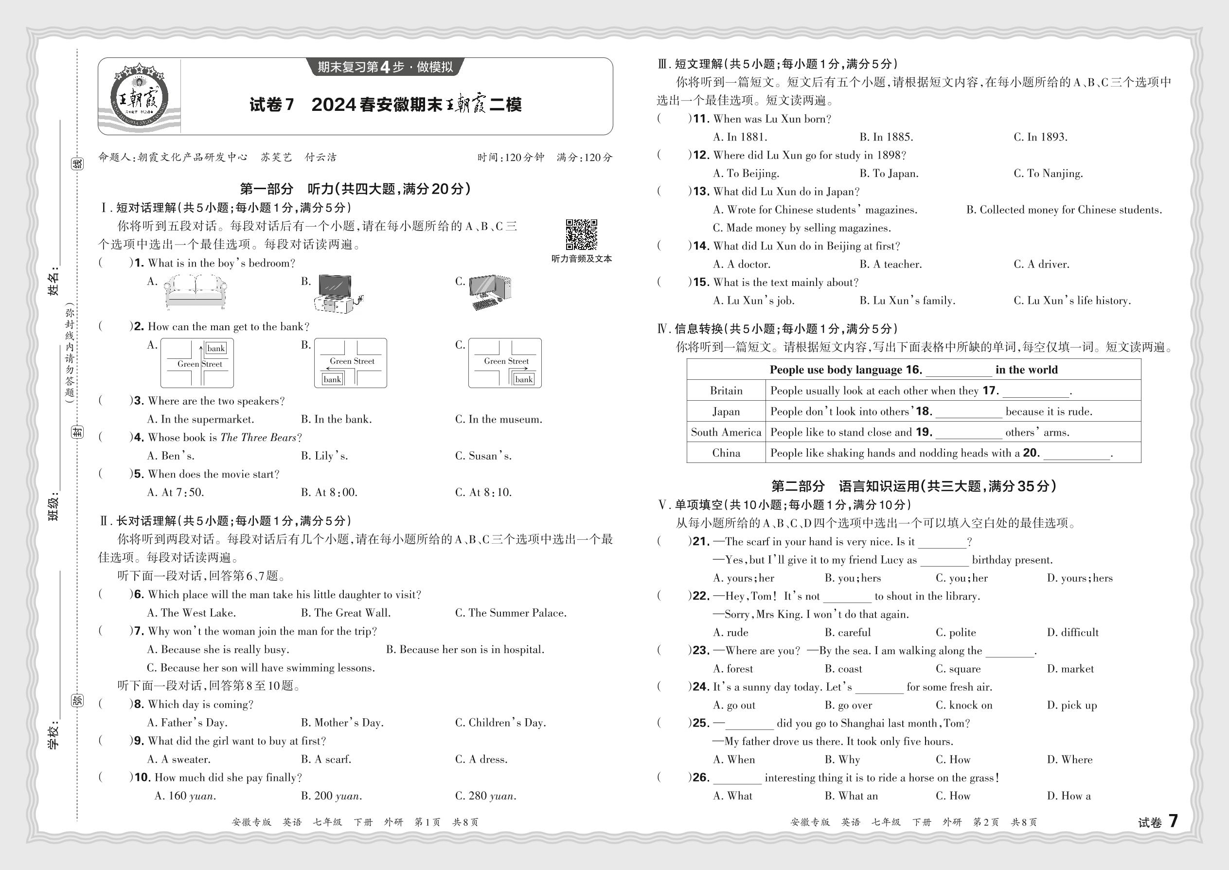 2024春下册七年级英语外研版 安徽期末王朝霞二模