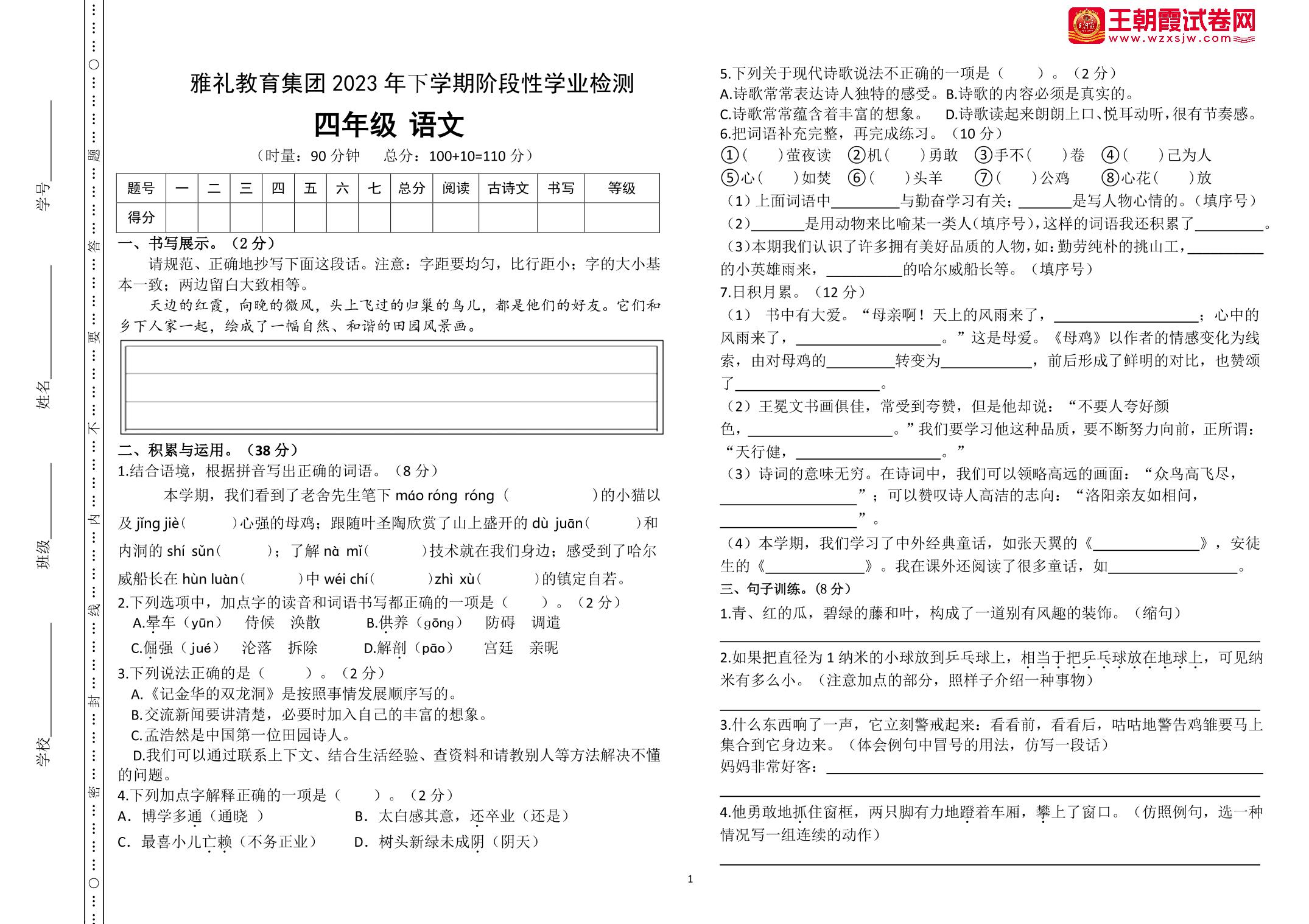 湖南省怀化市雅礼教育集团2022-2023学年下学期期末阶段性学业检测四年级语文(人教版)
