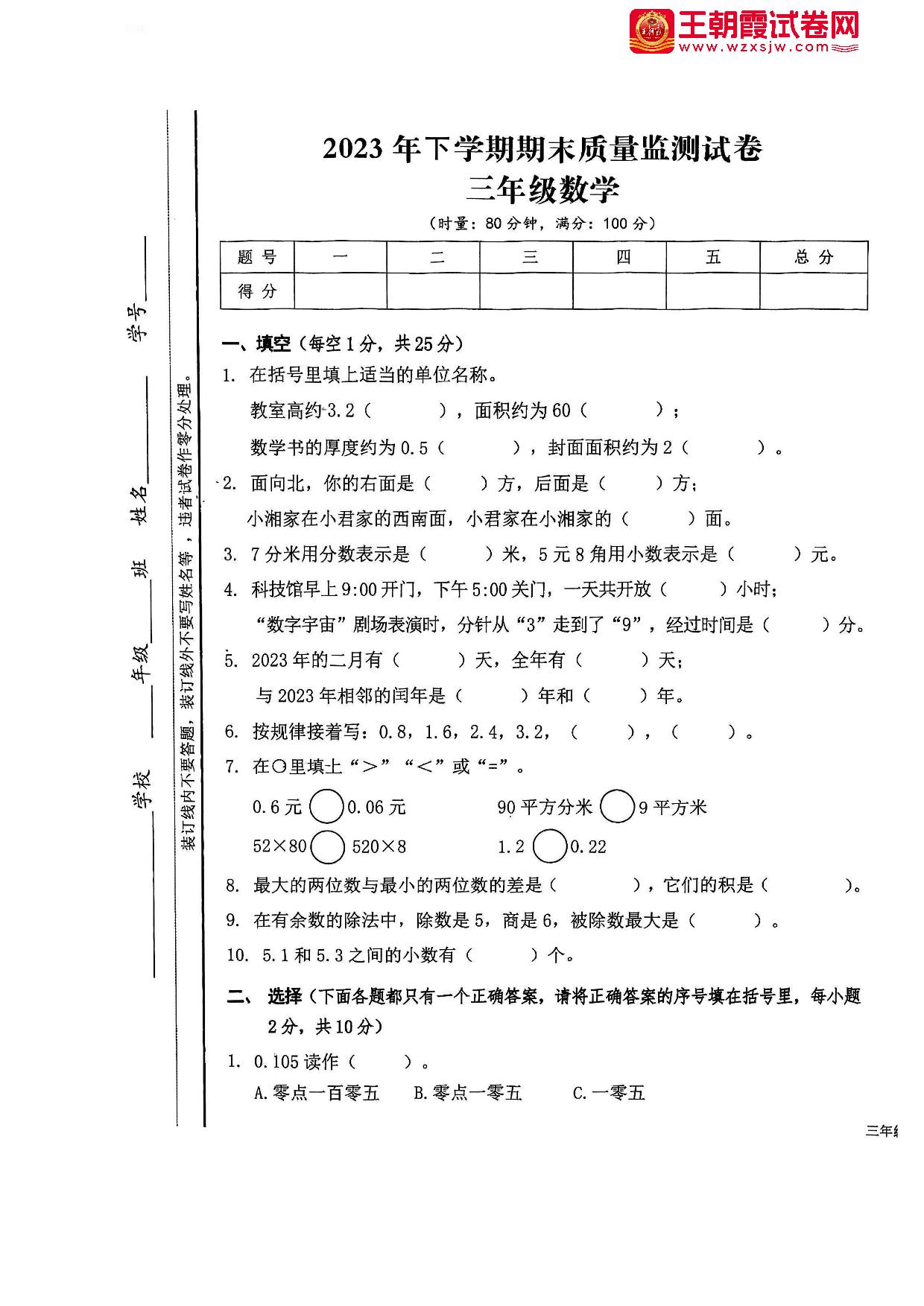 湖南省湘潭市雨湖区2022-2023学年下学期期末质量监测试卷三年级数学(人教版)