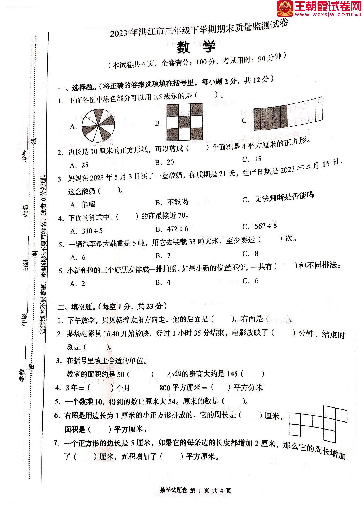 三年级数学人教版下册期末卷