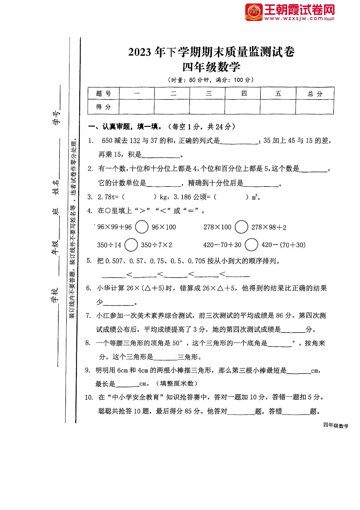 湖南省湘潭市雨湖区2022-2023学年下学期期末质量监测试卷四年级数学(人教版)