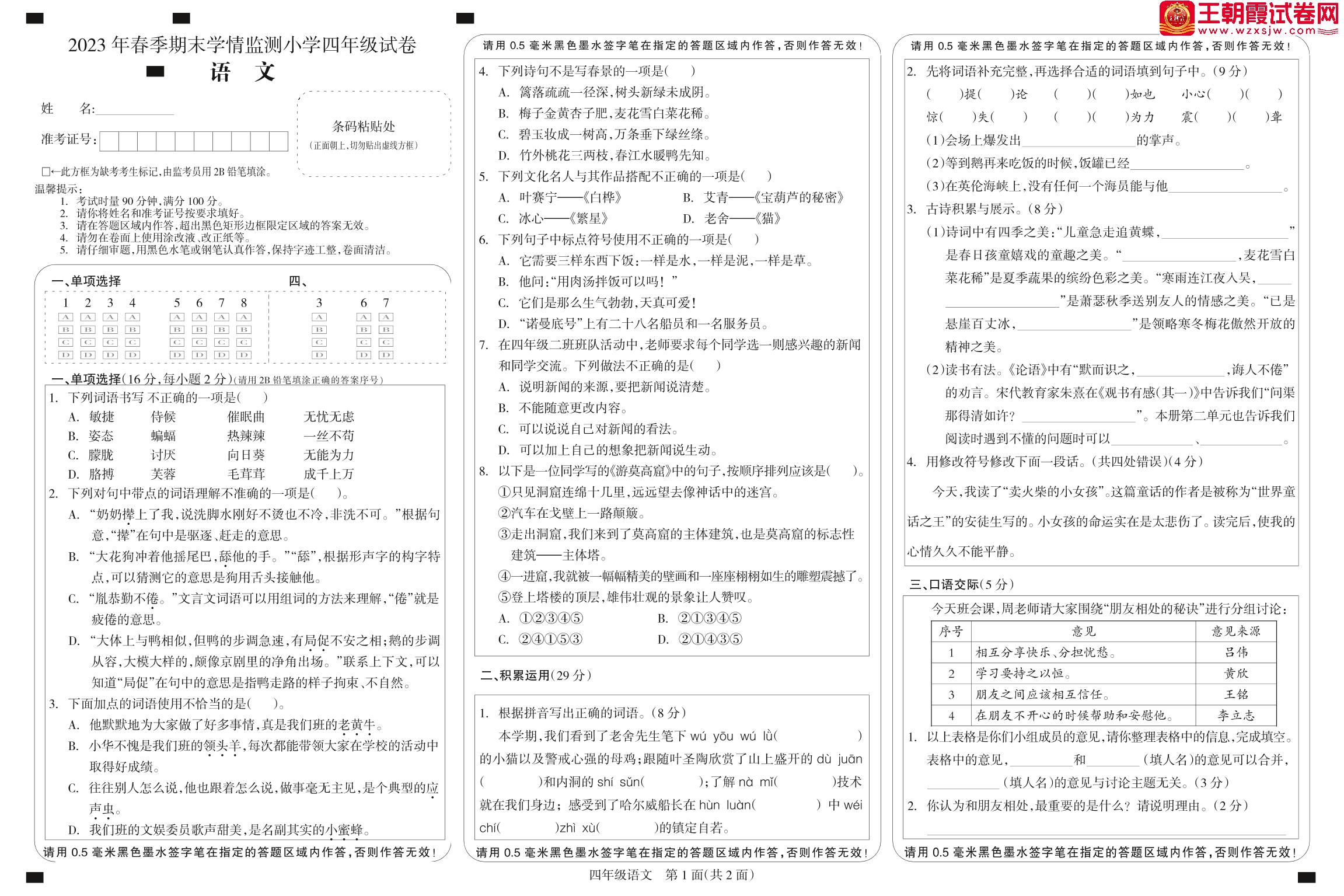 湖南省邵阳市邵阳县2023年春季期末学情监测试卷四年级语文(人教版)