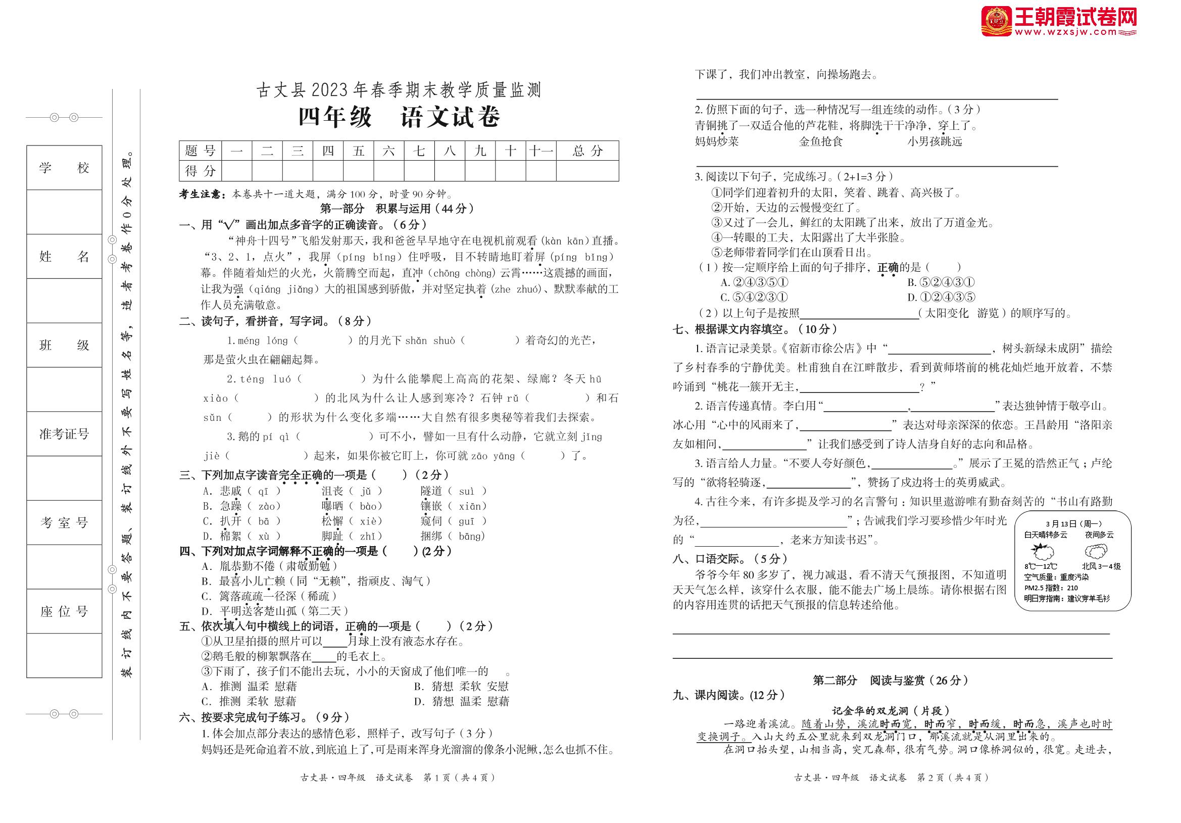 湖南省湘西州古丈县2023年春季期末教学质量监测四年级语文(人教版)