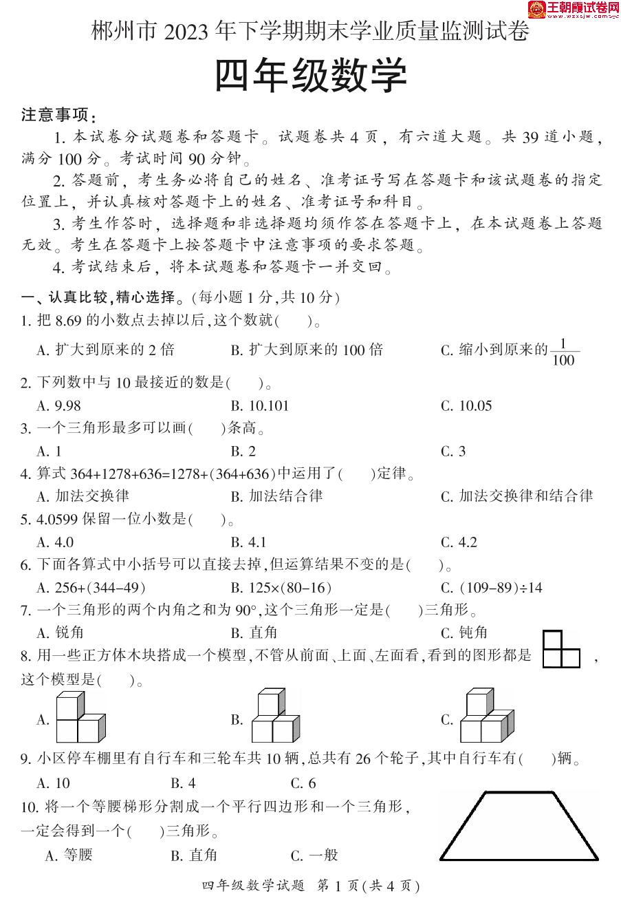 湖南省郴州市2022-2023学年下学期期末学业质量监测试卷四年级数学(人教版)
