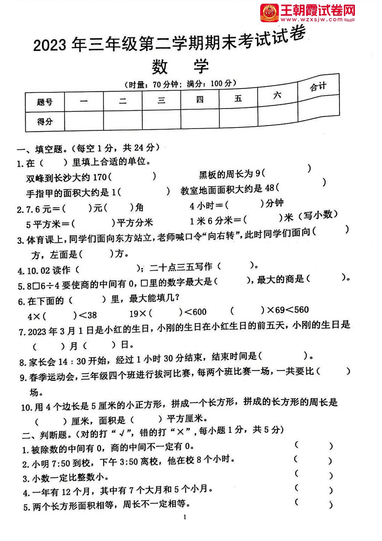 湖南省娄底市双峰县2022-2023学年第二学期期末考试试卷三年级数学(人教版)