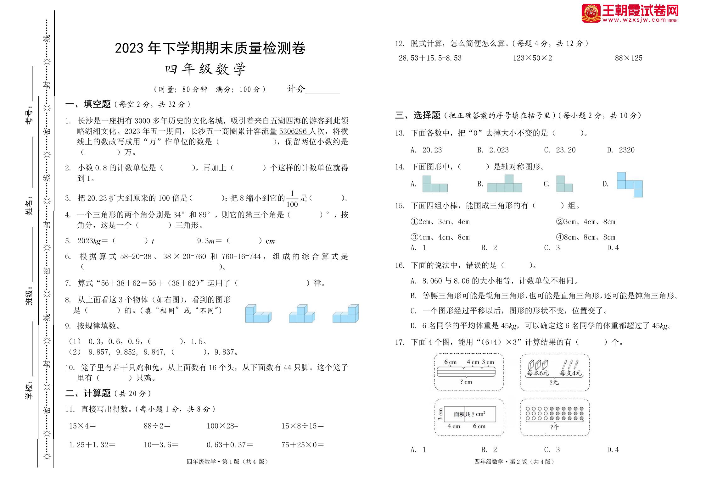湖南省长沙市雨花区2022-2023学年下学期期末质量检测卷四年级数学(人教版)