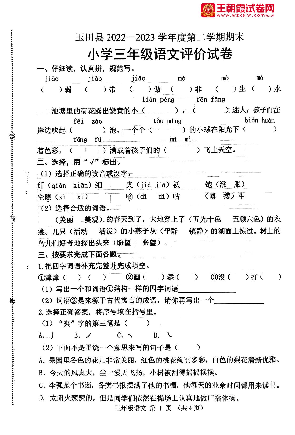 河北省唐山市玉田县2022-2023学年度第二学期期末评价试卷三年级语文(人教版)