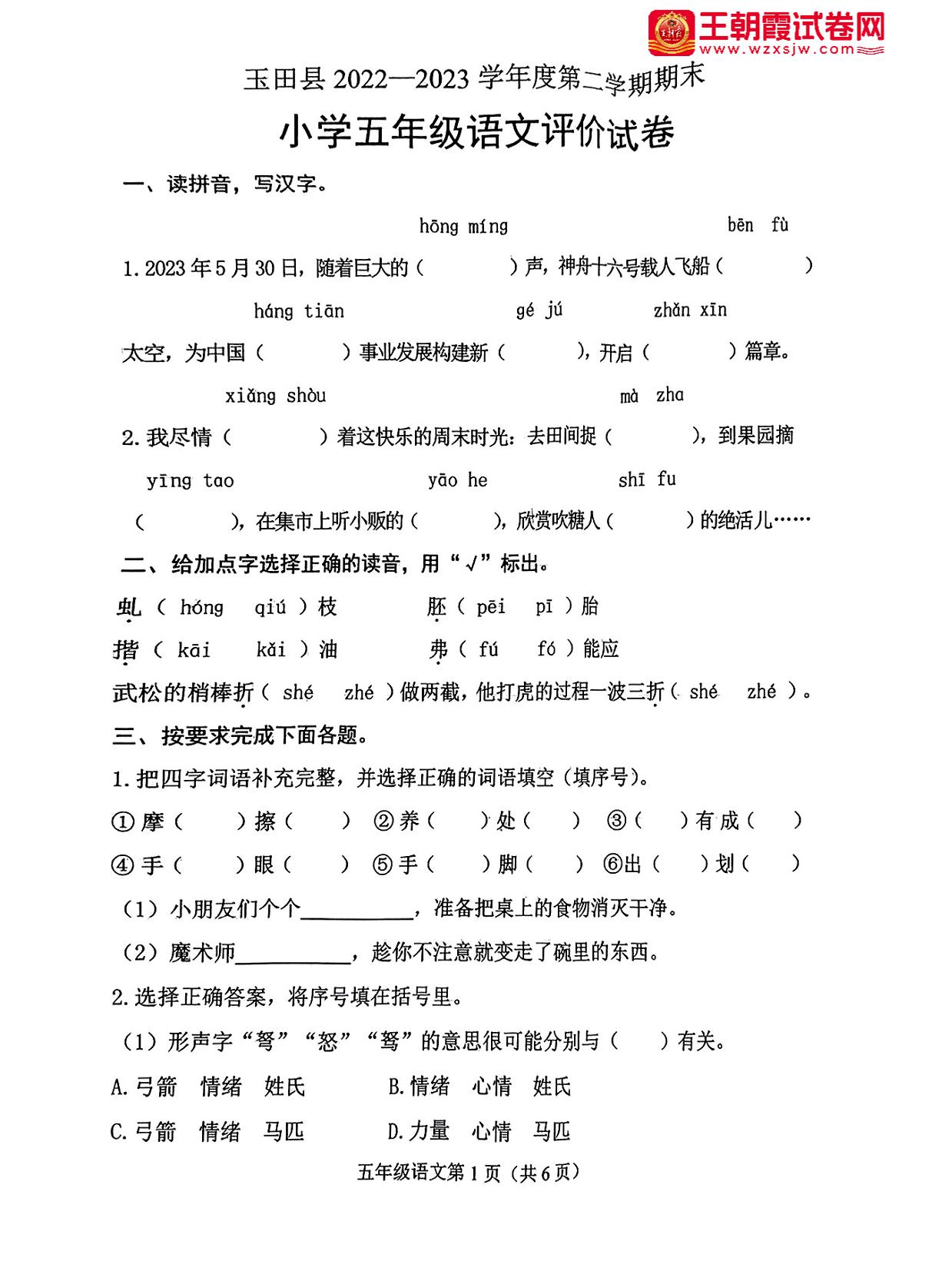 河北省唐山市玉田县2022-2023学年度第二学期期末评价试卷五年级语文(人教版)