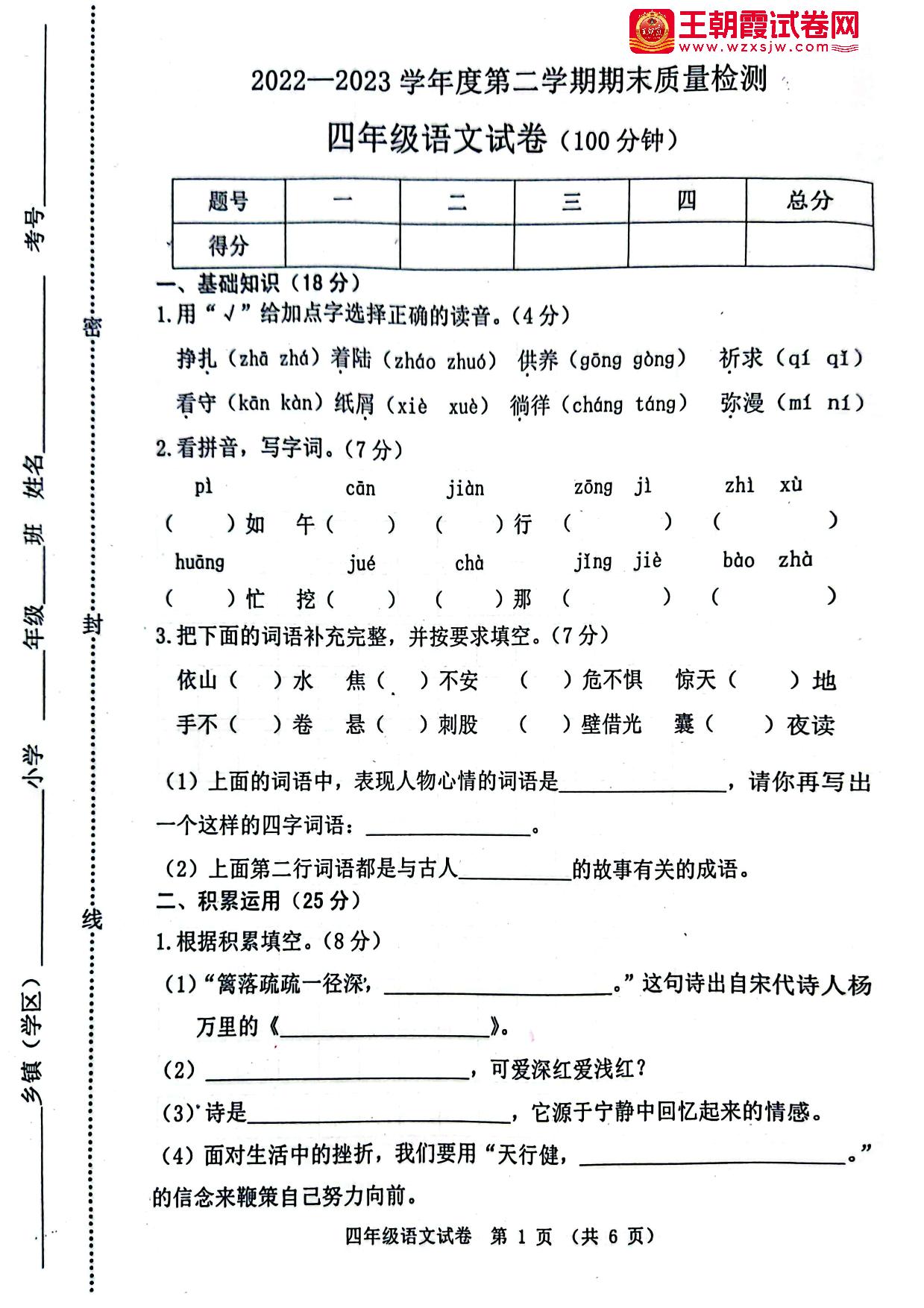 四年级语文人教版下册期末卷