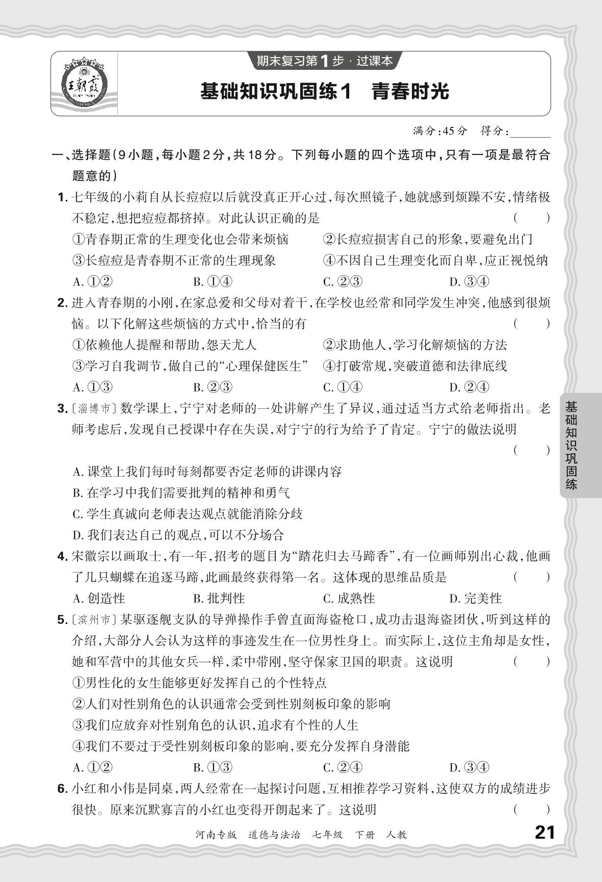 2024春下册七年级道德与法治人教版 期末过课本河南版·基础知识巩固练 青春时光【1】