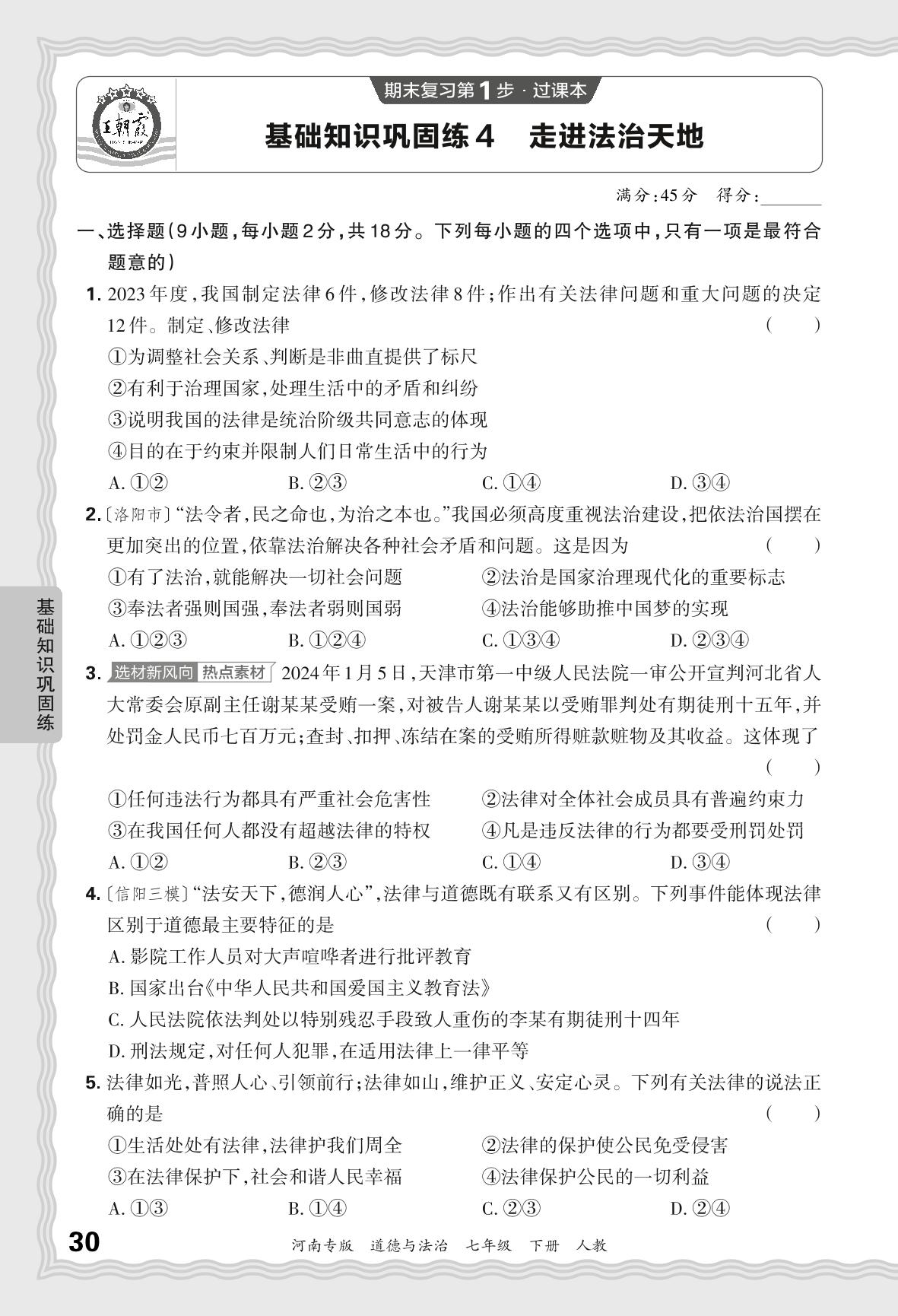2024春下册七年级道德与法治人教版 期末过课本河南版·基础知识巩固练 走进法治天地【4】