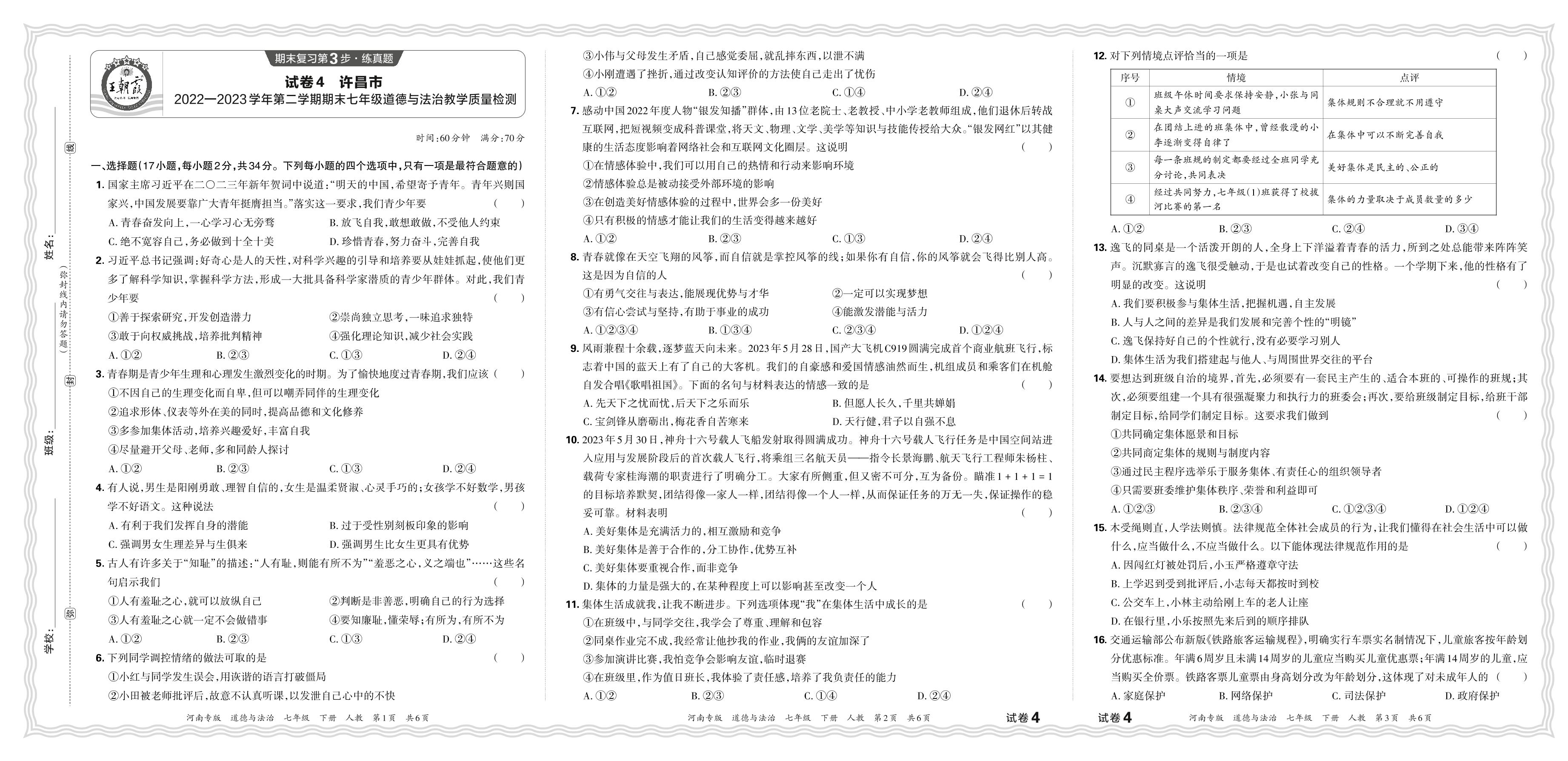 河南省许昌市2022-2023学年第二学期期末七年级道德与法治教学质量检测(人教版)【4】