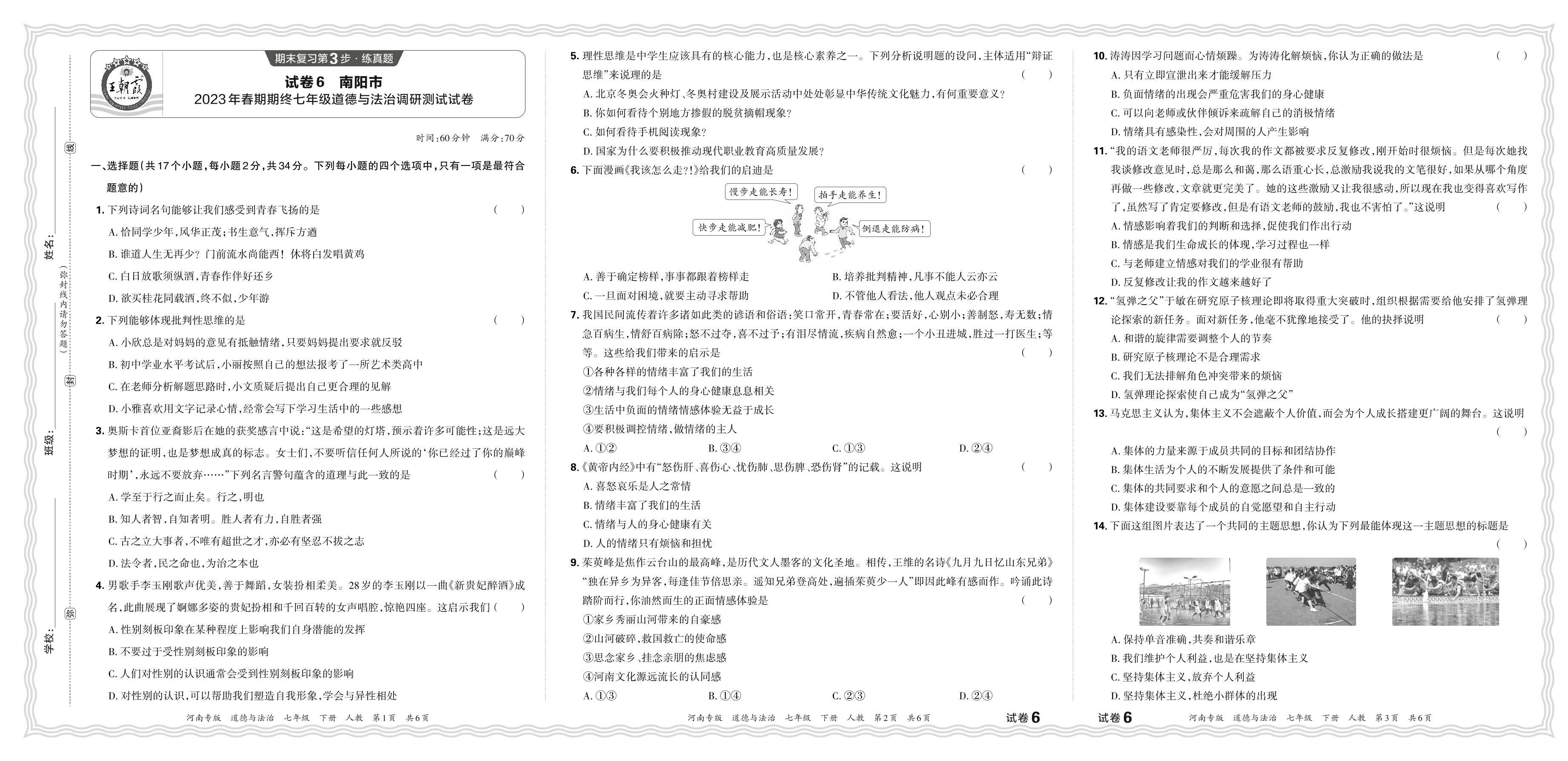 河南省南阳市2023年春期期终七年级道德与法治调研测试试卷(人教版)【6】