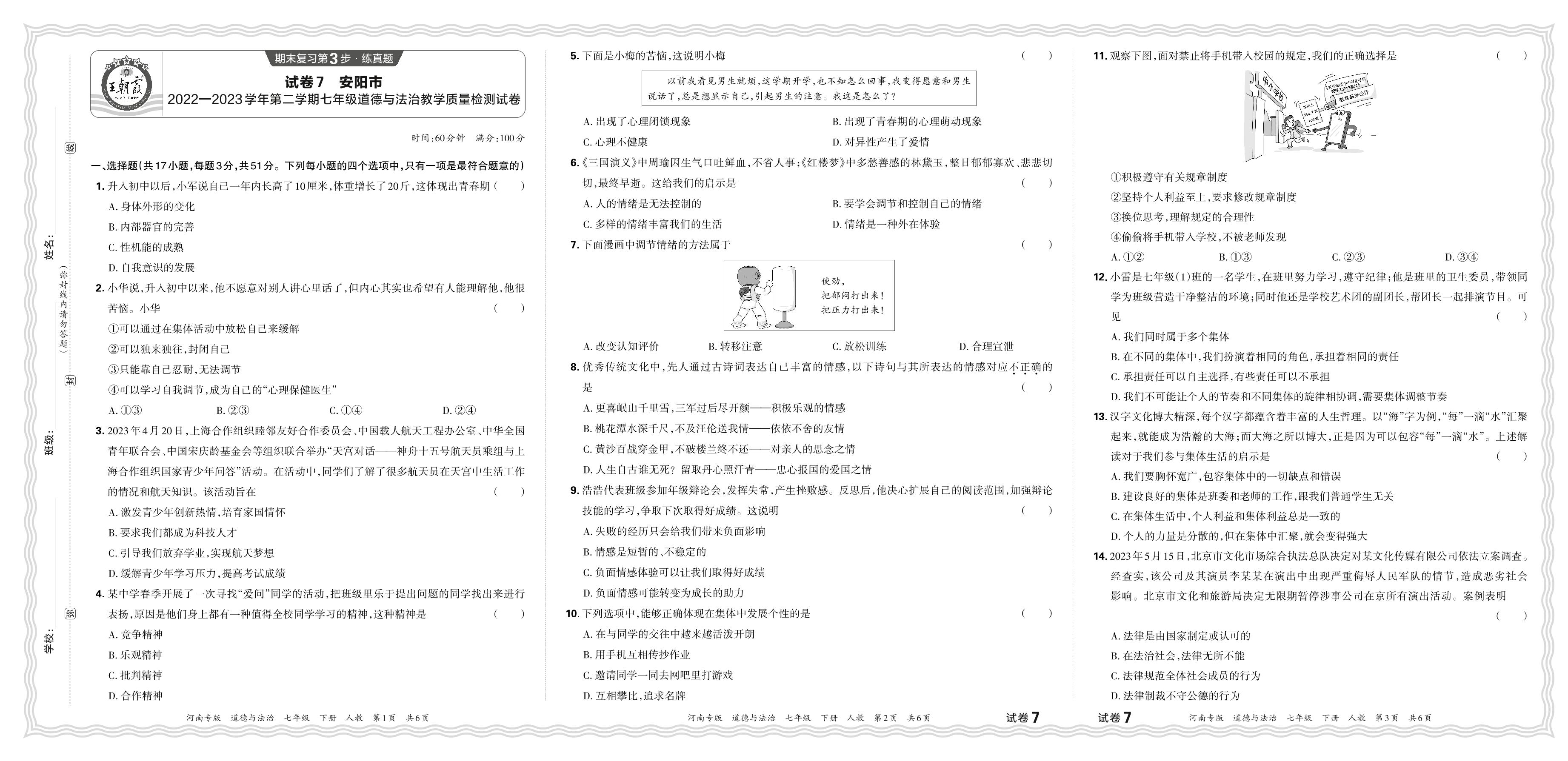 河南省安阳市2022-2023学年第二学期期末七年级道德与法治教学质量检测试卷(人教版)【7】