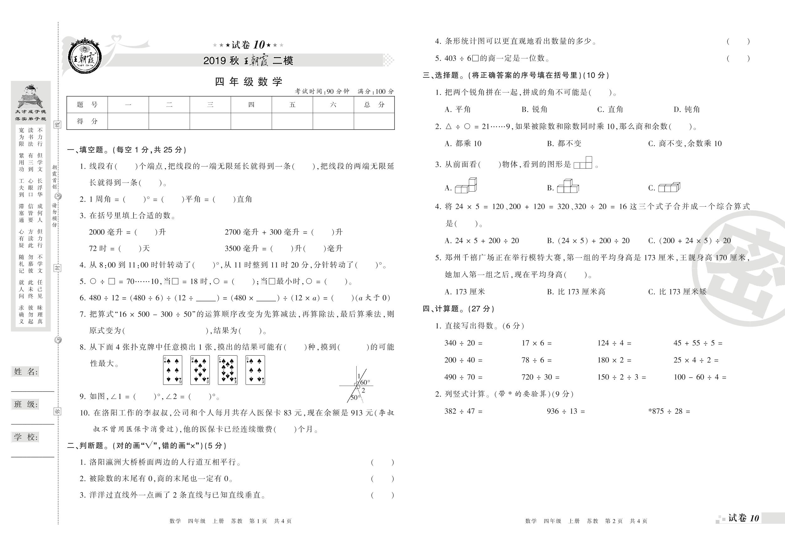 王朝霞期末模拟卷四年级上册数学(苏教版)_R210804143956【10】