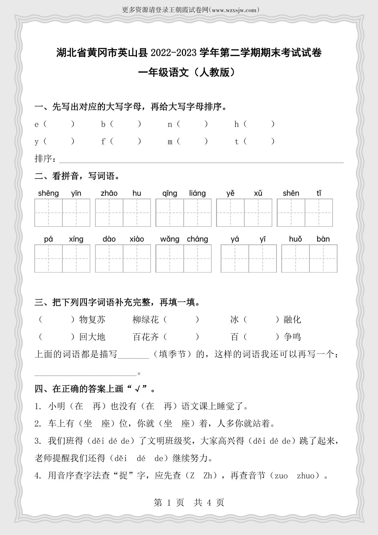 湖北省黄冈市英山县2022-2023学年第二学期期末考试试卷一年级语文(人教版)