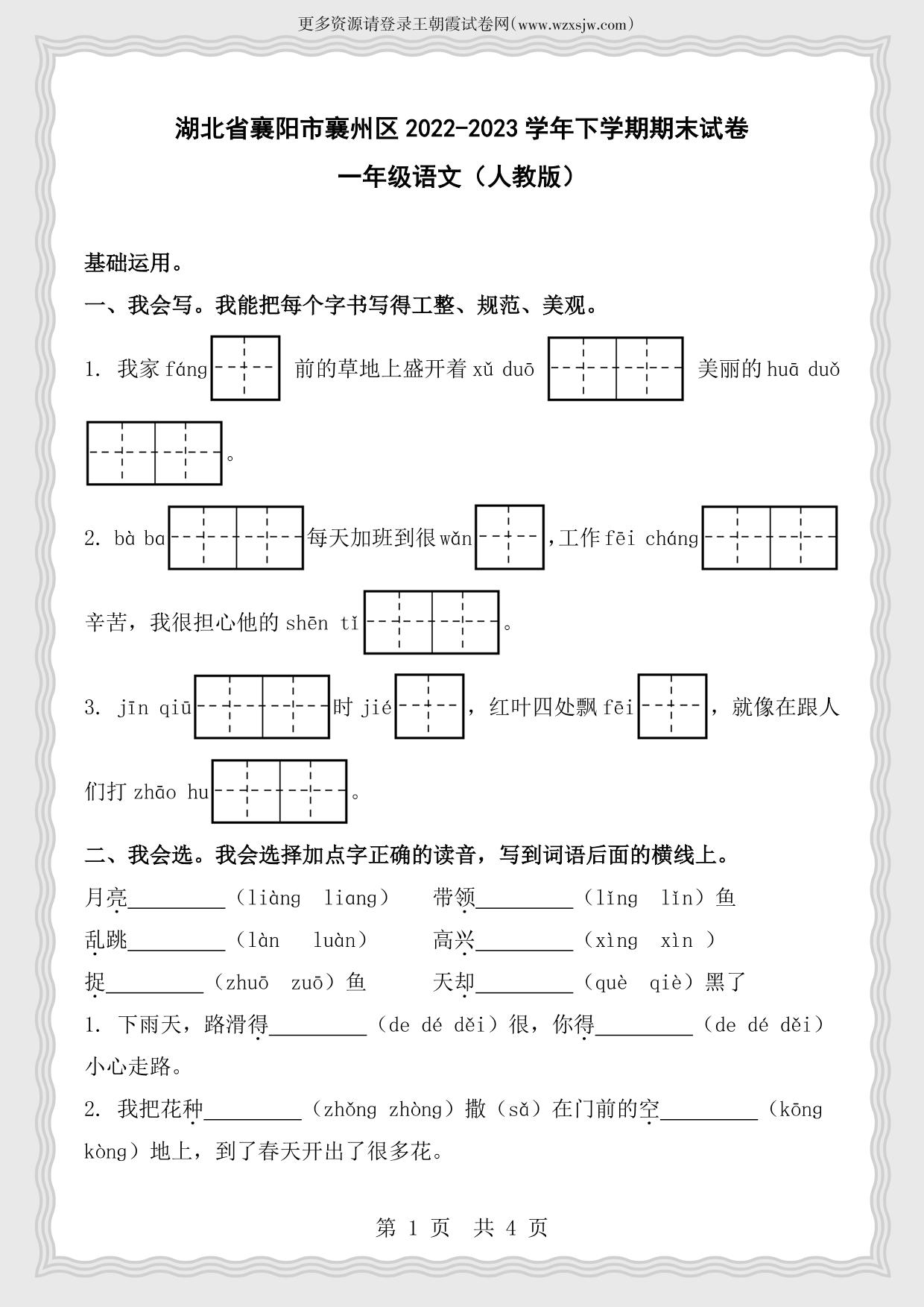 湖北省襄阳市襄州区2022-2023学年下学期期末试卷一年级语文(人教版)