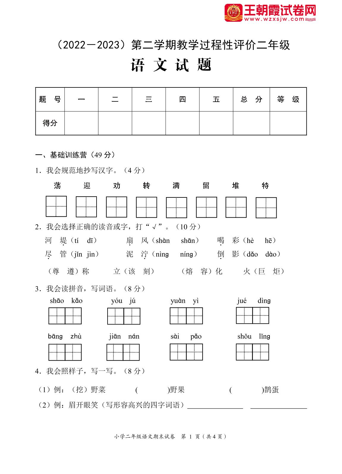 湖北省孝感市应城市2022-2023学年下学期期末教学过程性评价试题二年级语文(人教版)