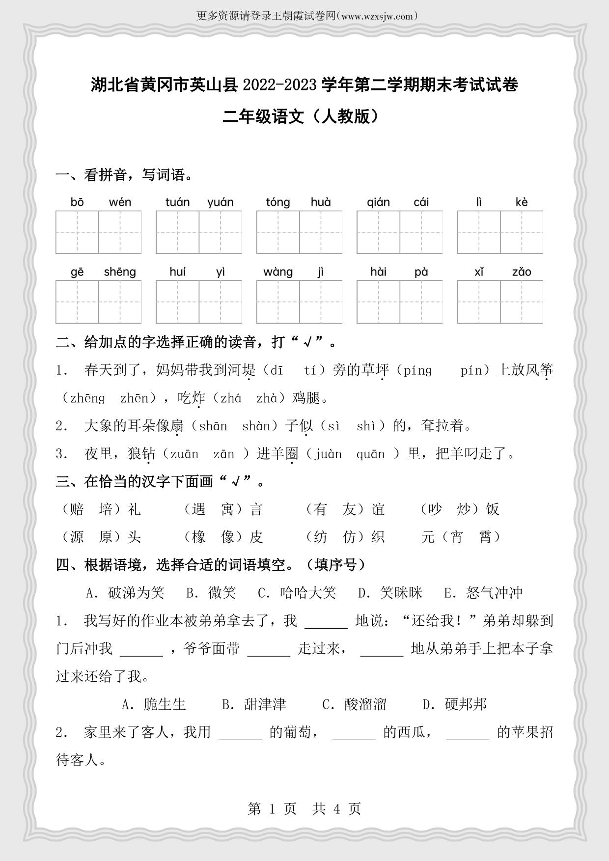 湖北省黄冈市英山县2022-2023学年第二学期期末考试试卷二年级语文(人教版)