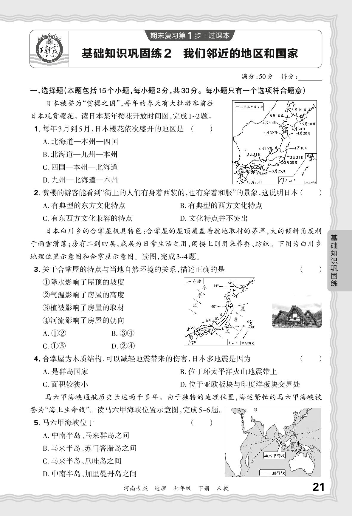 2024春下册七年级地理人教版 期末过课本河南版·基础知识巩固练 我们临近的地区和国家【2】