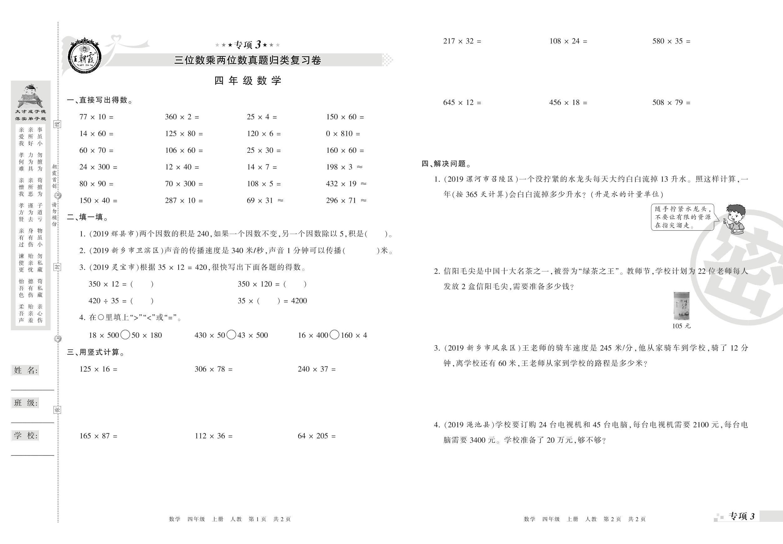 王朝霞期末专项卷——三位数乘两位数、平行四边形和梯形真题归类复习四年级上册数学(人教版)_R210804144013【0】