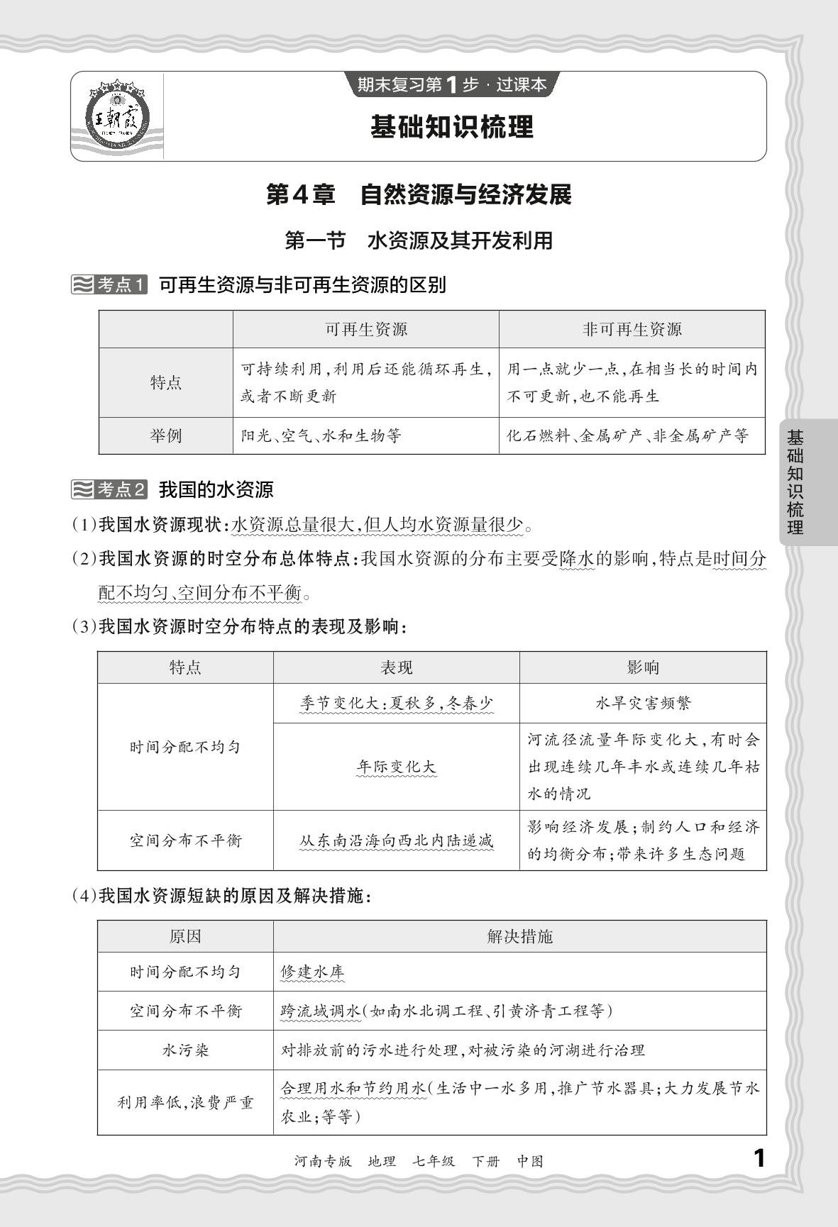 2024春下册七年级地理中图版 期末过课本河南版·基础知识梳理 第4章 自然资源与经济发展
