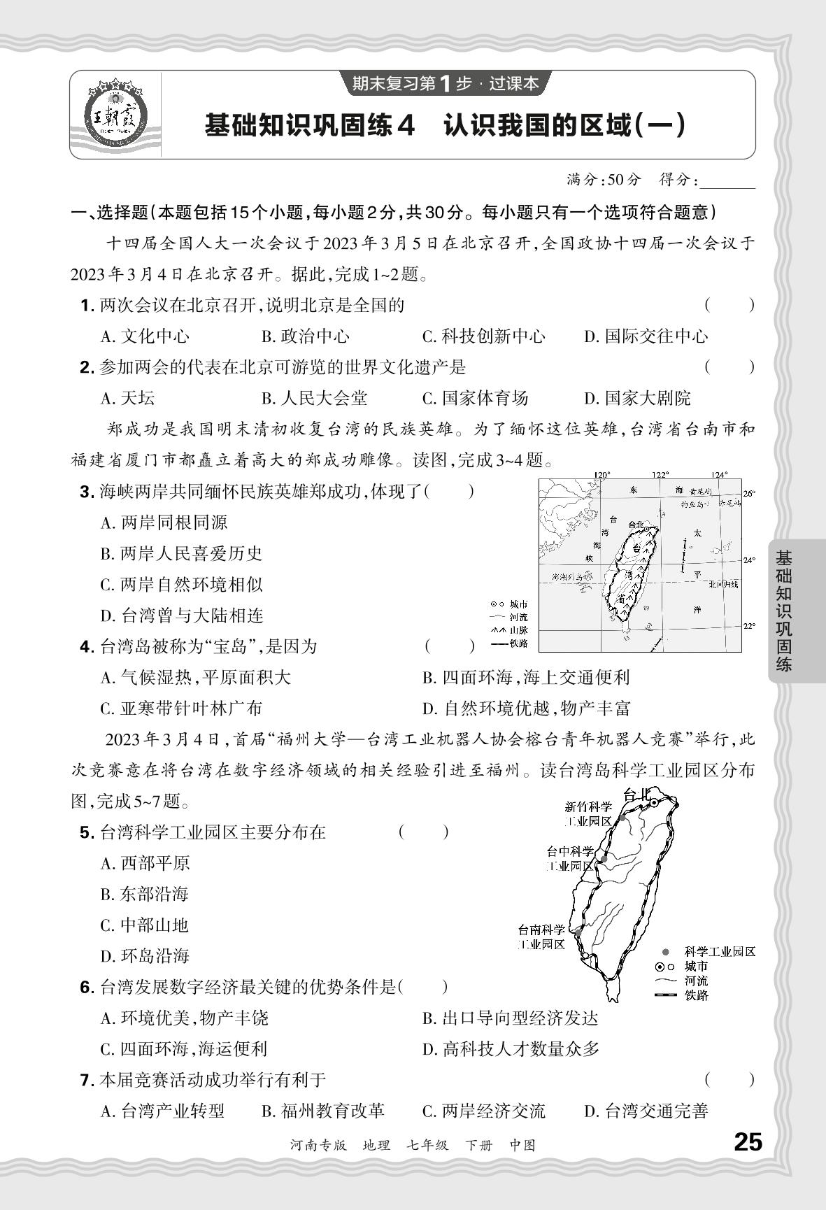 2024春下册七年级地理中图版 期末过课本河南版·基础知识巩固练 认识我国的区域(一)【4】