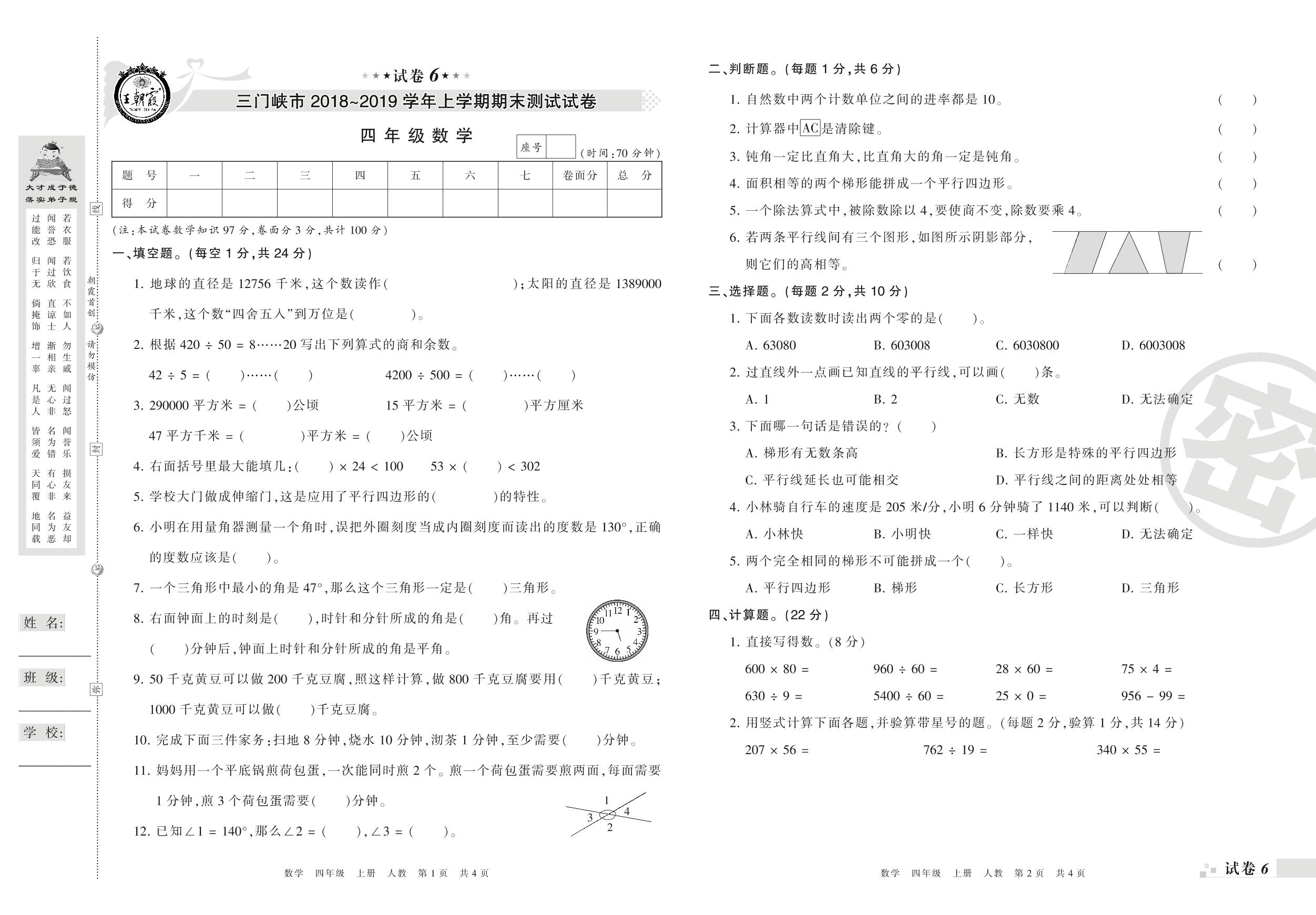 2018-2019学年第一学期三门峡市四年级数学试卷(人教版)【6】