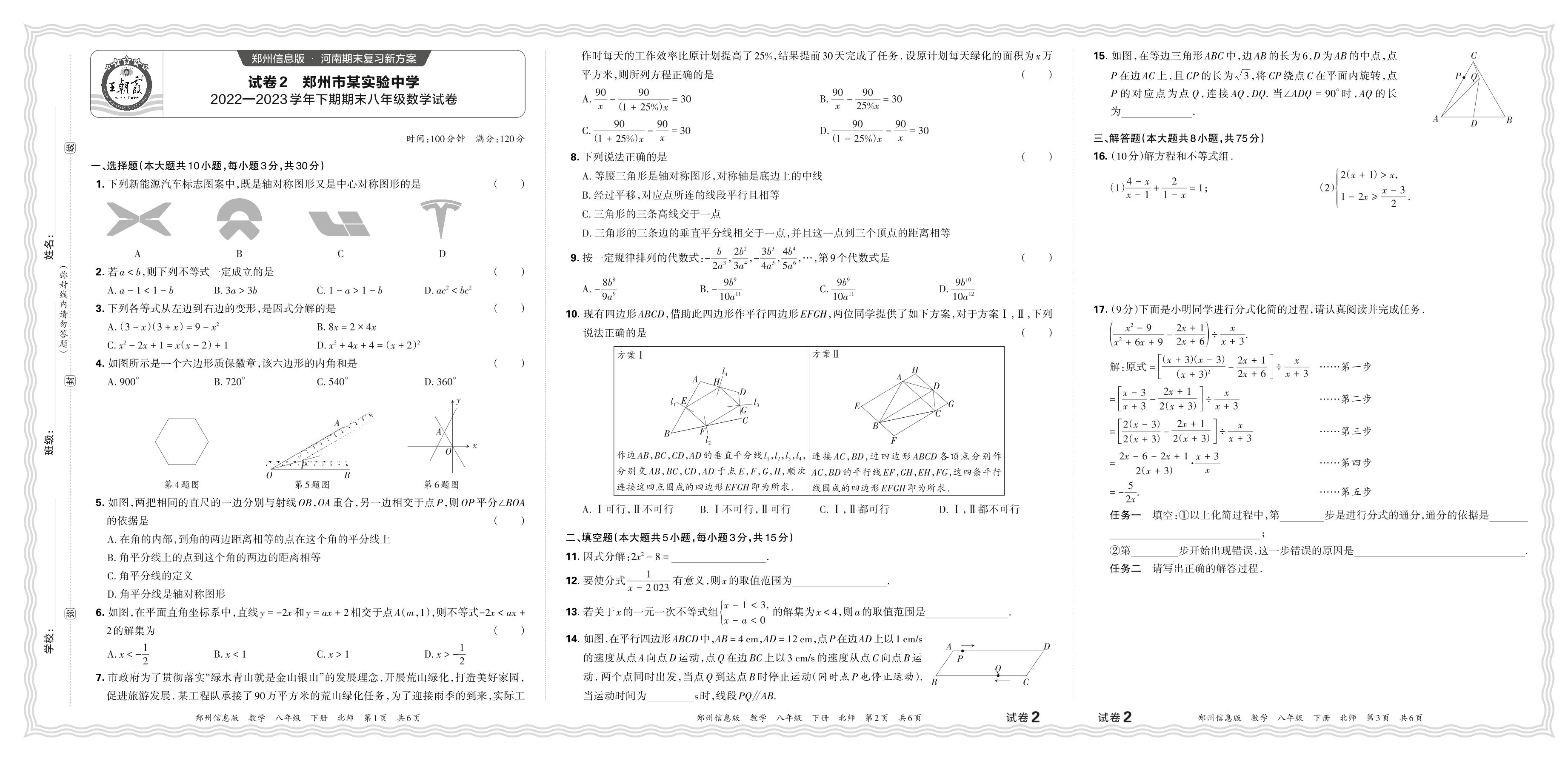 河南省郑州市某实验中学2022-2023学年下学期期末八年级数学试卷(北师版)【2】