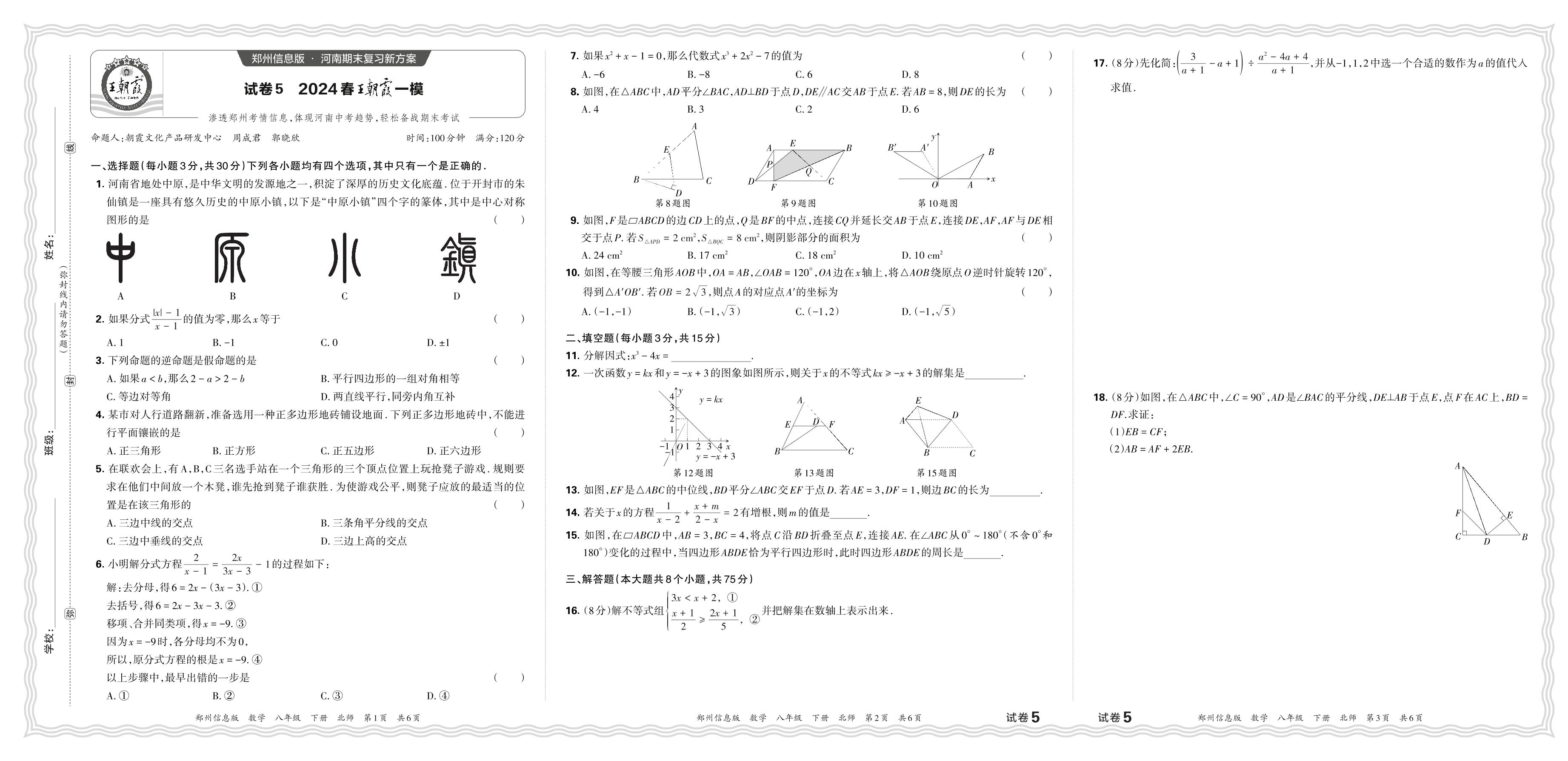 2024春下册八年级数学北师版 郑州期末王朝霞一模