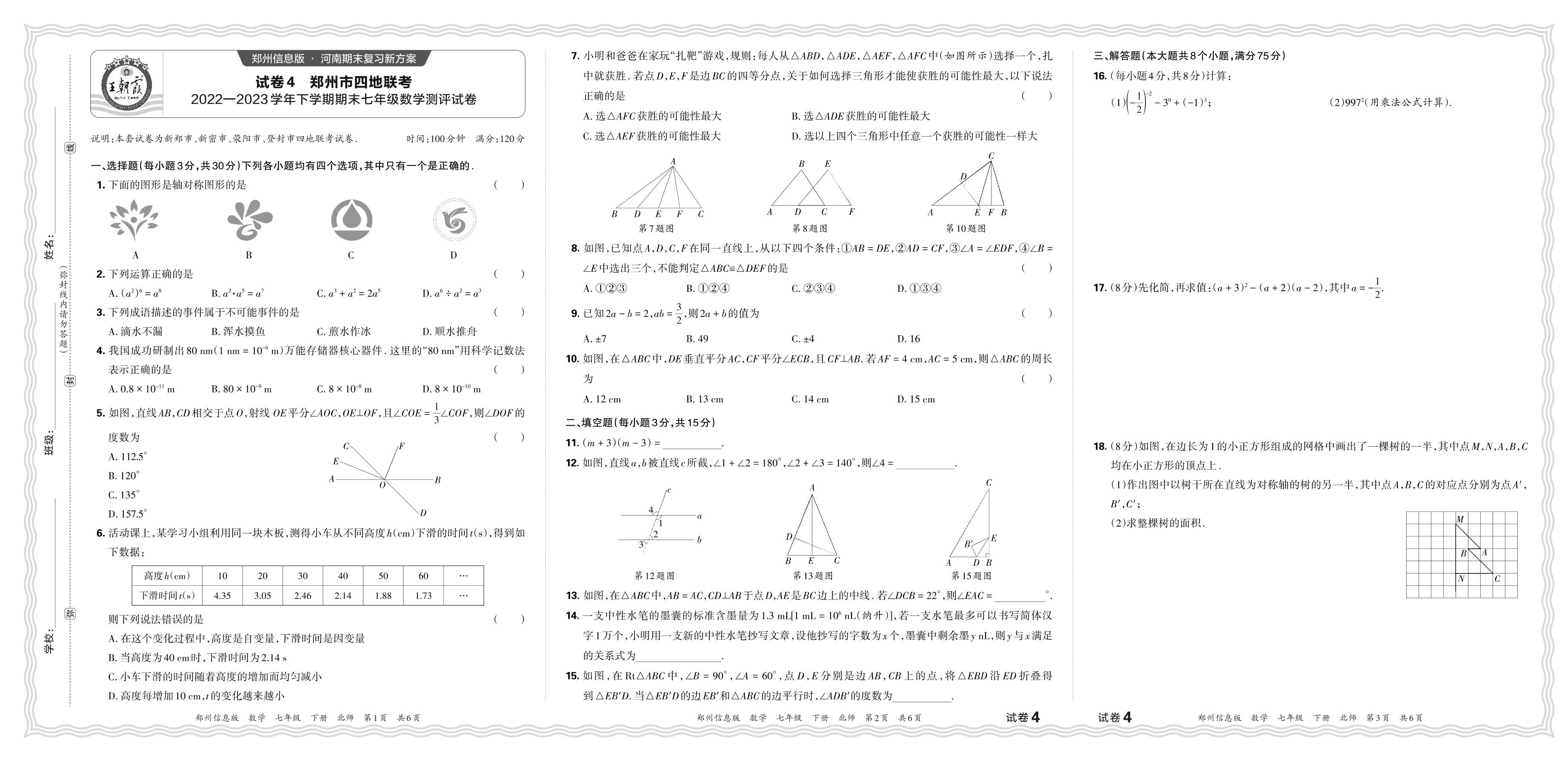 河南省郑州市四地联考2022-2023学年下学期期末七年级数学测评试卷(北师版)【4】