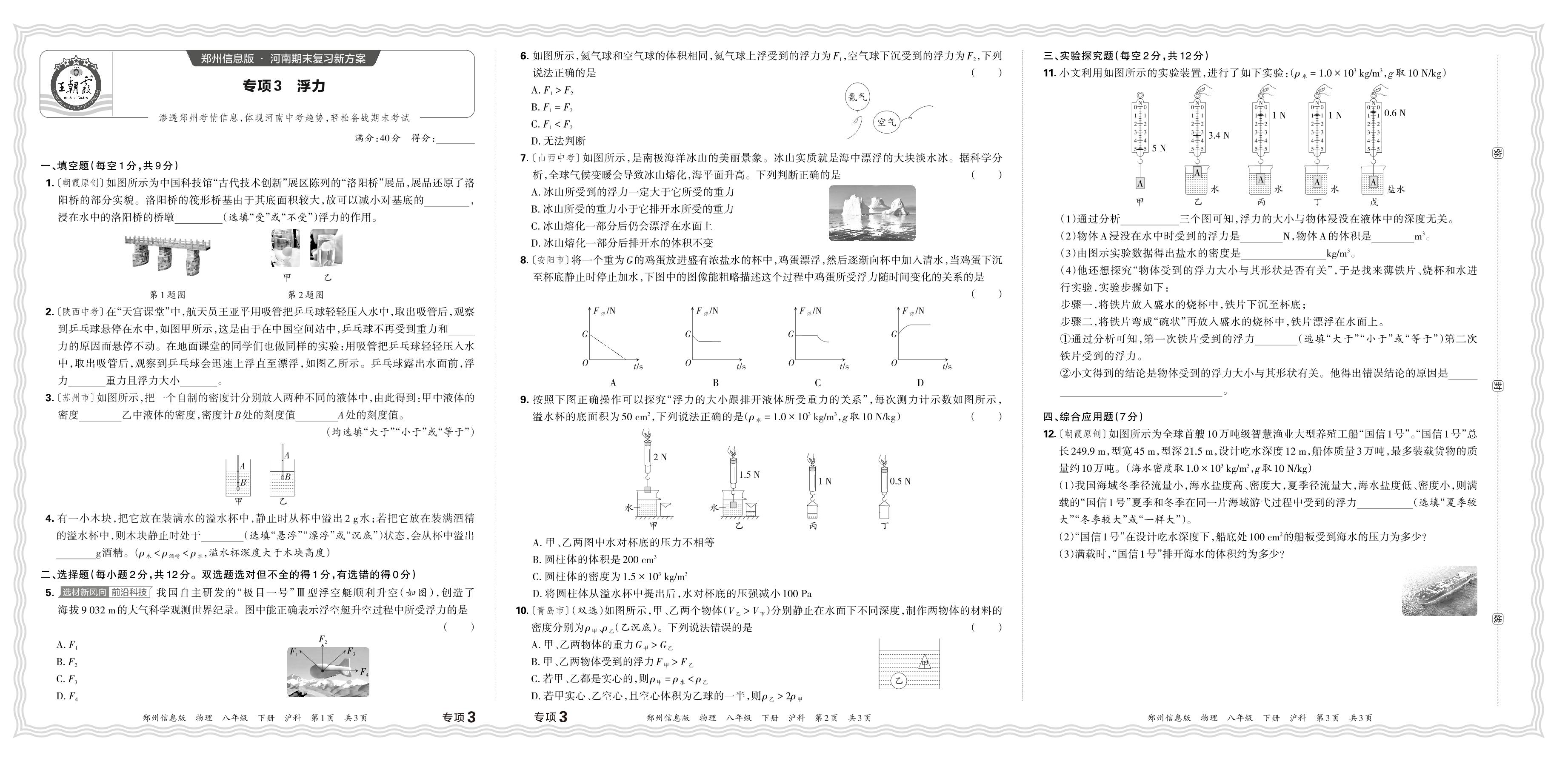 2024春下册八年级物理沪科版 期末专项卷郑州版·浮力【3】