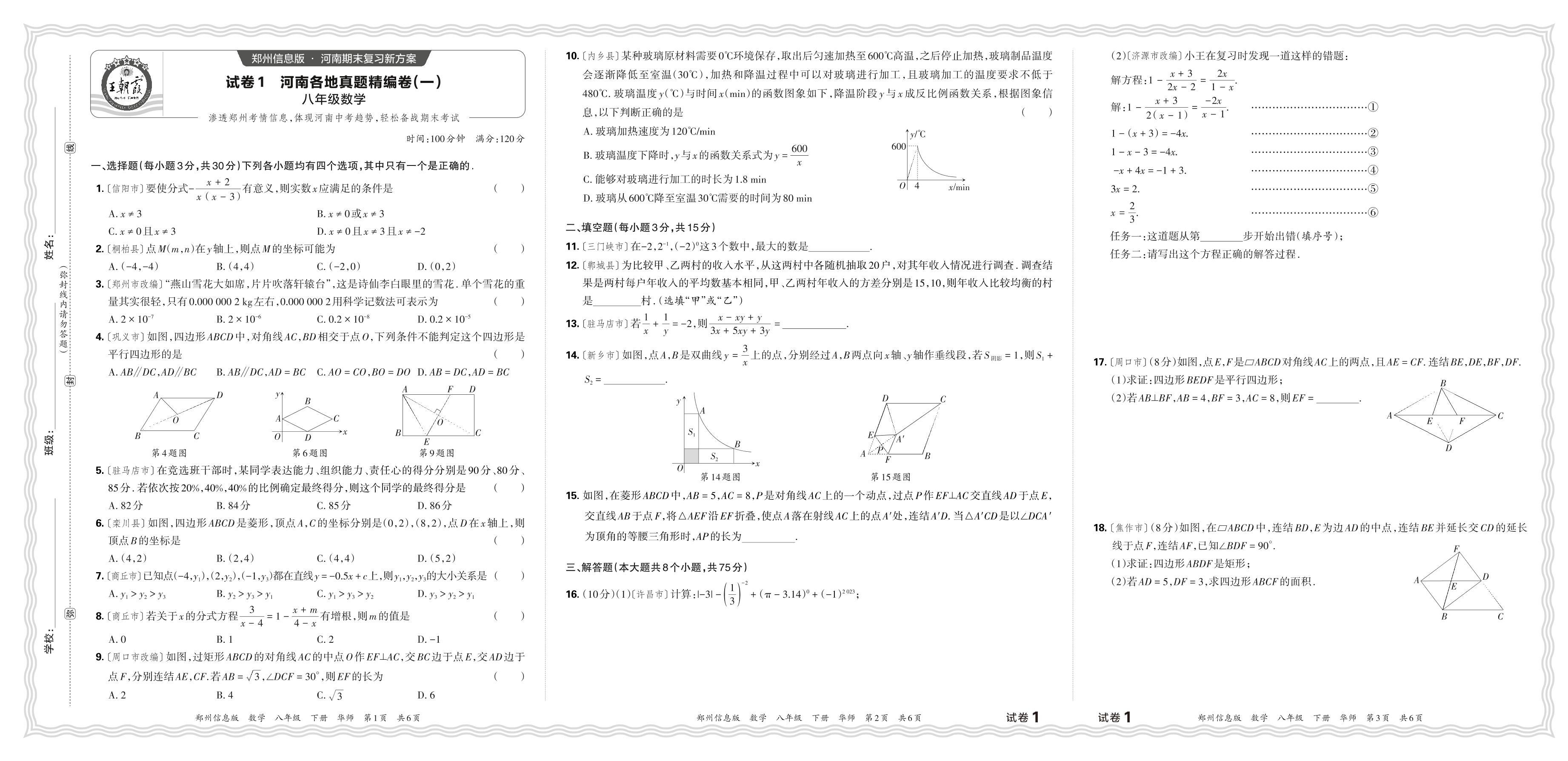 2024年春河南各地真题精编(一)八年级下册期末数学(华师版)【1】