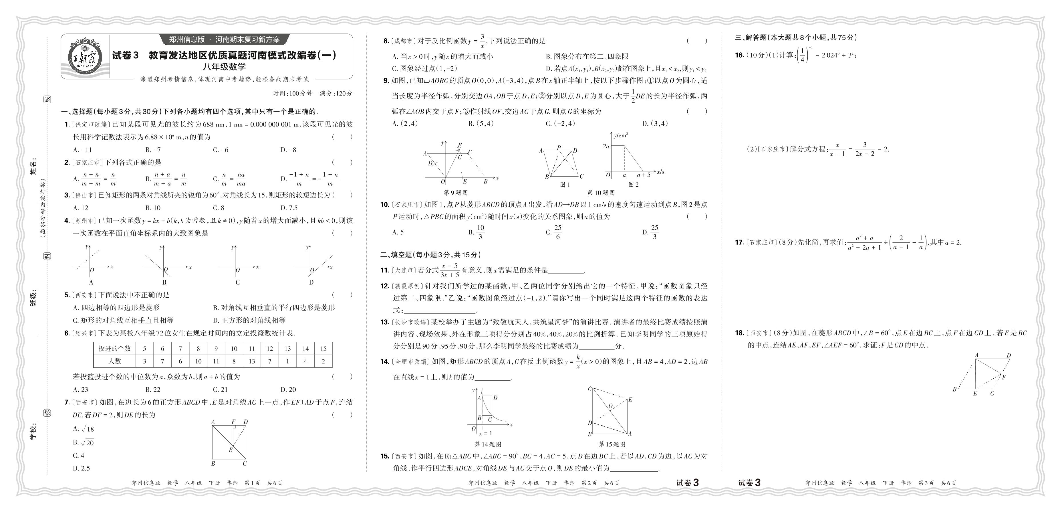 2024年春教育发达地区优质真题河南模式改编卷(一)八年级下册期末数学(华师版)【3】